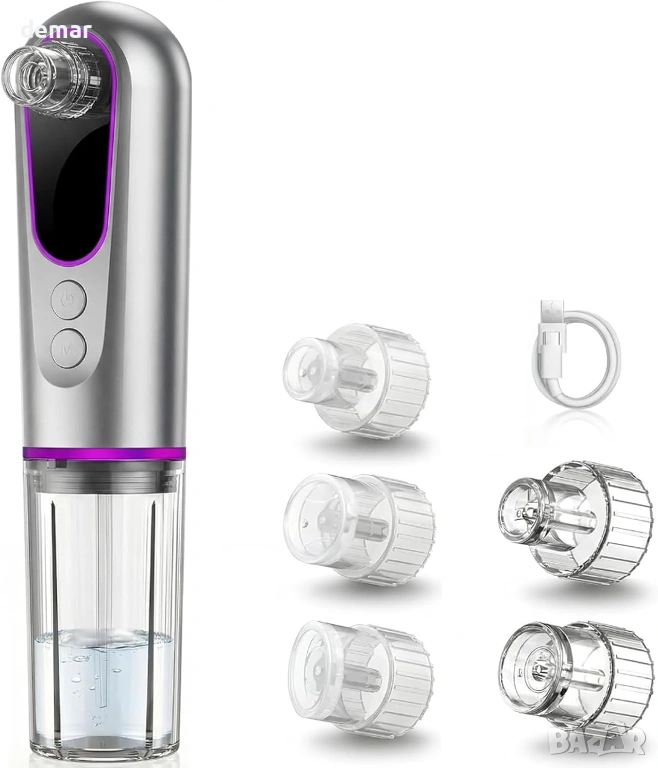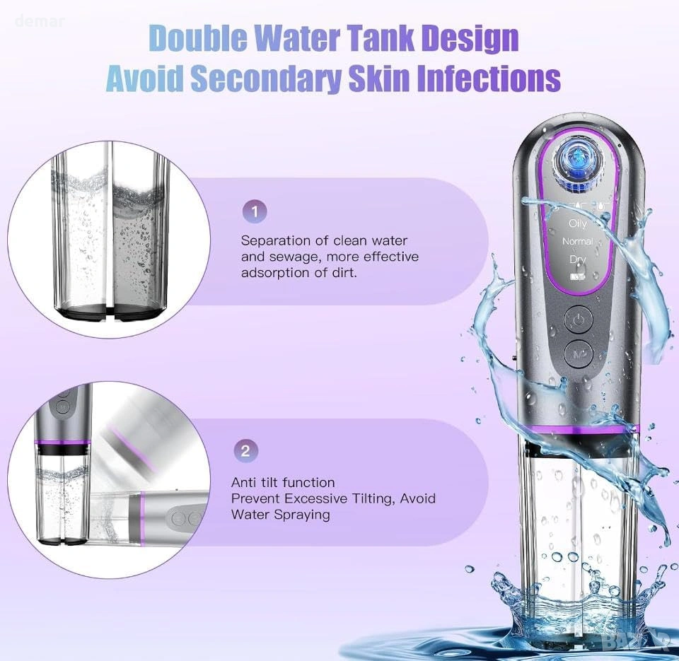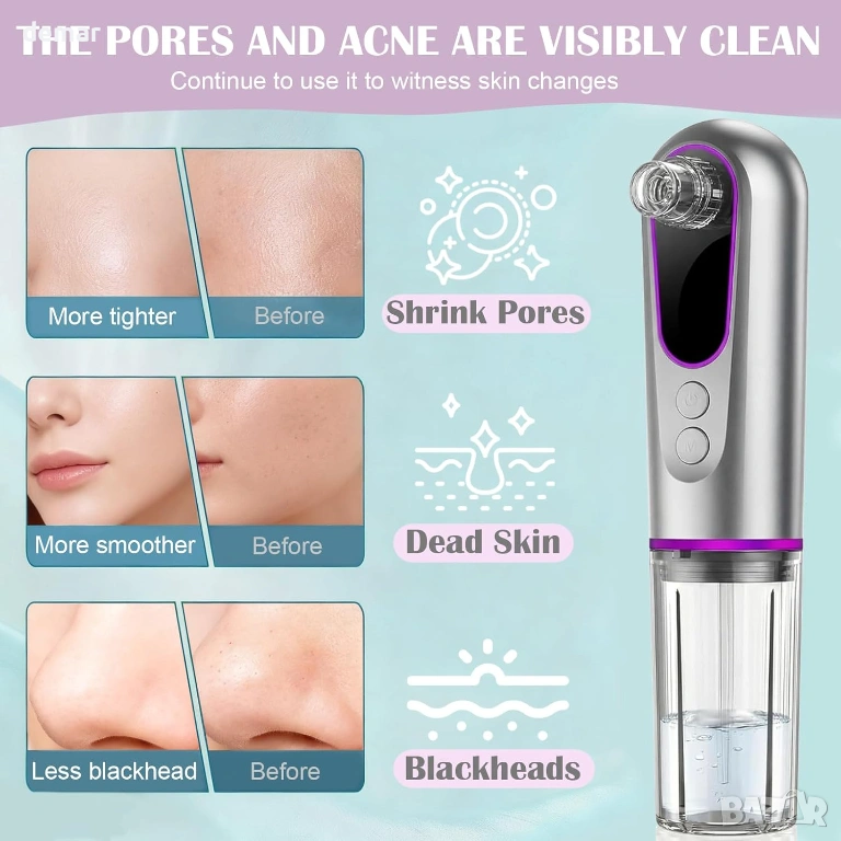 Тази вакуумна помпа за пори на лице разполага със система с двоен резервоар за вода, която отделя чистата вода от извлечените примеси за подобрена хигиена и по-последователна употреба, докато нежният воден поток помага за омекотяване на порите и разхлабване на замърсяванията преди засмукване, намалявайки раздразнението в сравнение със сухите методи. Тя предлага три регулируеми режима – нежен за чувствителна кожа, стандартен за ежедневно почистване и по-силно засмукване за по-мазни зони – което позволява персонализирана рутина на грижа за кожата. Устройството включва пет сменяеми всмукателни глави, предназначени за различни зони на лицето, осигуряващи по-прецизно и ефективно почистване. Като цяло, то подпомага премахването на черни точки, бели точки и остатъци от козметика, като помага кожата да се чувства по-гладка, по-чиста и освежена след всяка употреба.