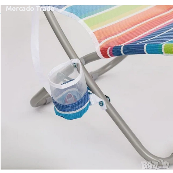 Стол без подлакътници, с цветна раирана материя Textilene и устойчив метален скелет. Със специална възглавничка в горната част за по-добра позиция на главата. От дясната страна има джоб (Ø10x10 см) за бутилка или голяма чаша. Сгъва се за съхранение и има ремък за лесно пренасяне.