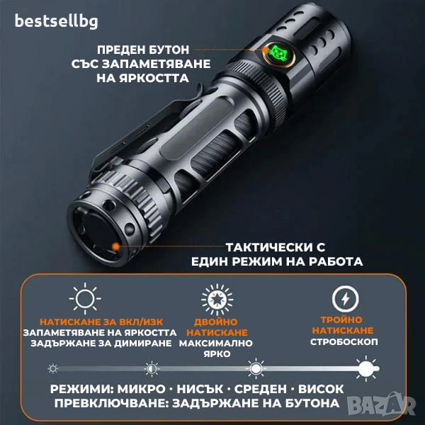 Режими: 5 (Микро, Слаб, Среден, Силен, Стробоскоп)