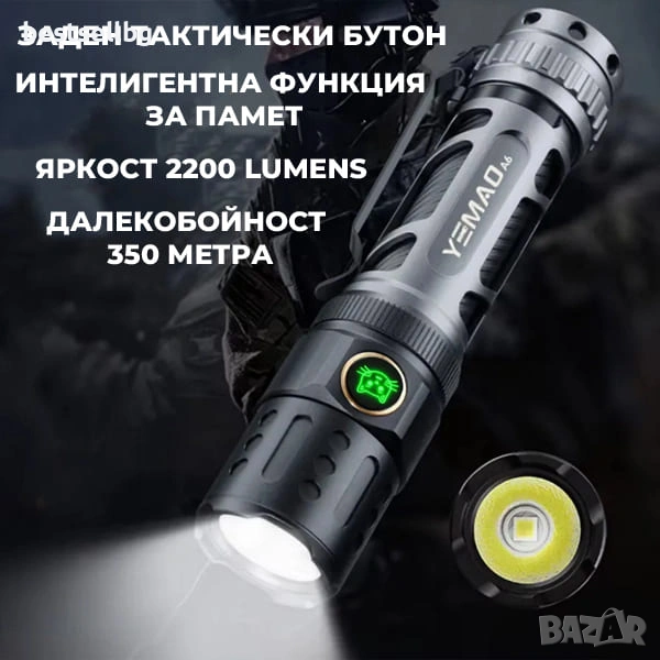 Мощен ръчен фенер YEMAO A6 2200 лумена USB-C, тактически, 350м обхват