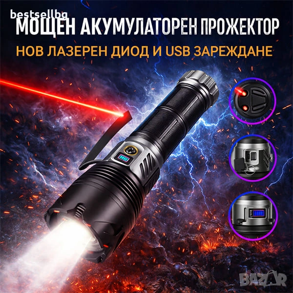 Освен осветление, този Мощен прожектор с лазерен диод може да зарежда други устройства – практично решение при пътувания и аварии.