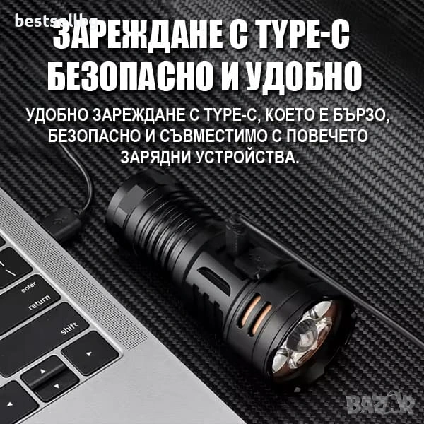 С Type-C порт, този Мощен ръчен фенер P35 се презарежда лесно за 3–5 часа, осигурявайки до 9 часа работа в зависимост от режима и батерията.