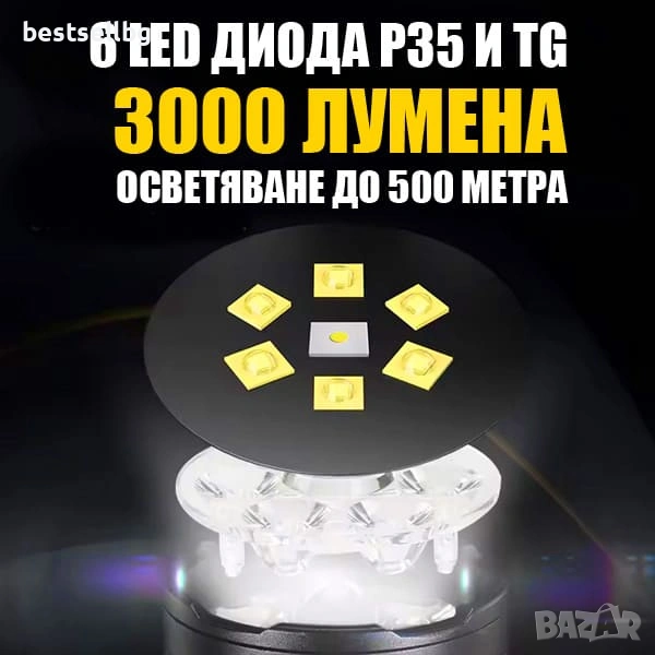 С 6 LED диода P35 и TG бял лазерен диод, този Мощен ръчен фенер P35 осигурява силна и концентрирана светлина, видима до 500 метра – перфектен за нощни мисии и наблюдение.