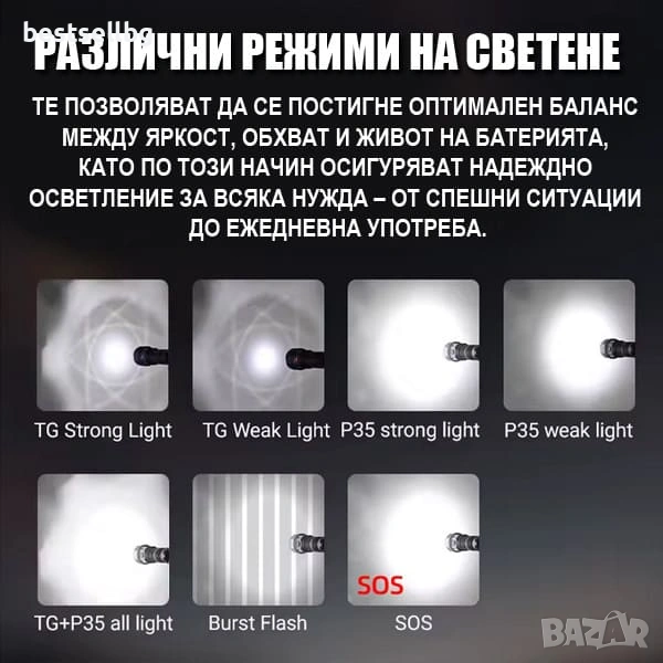 Режими: силна, средна, слаба, строб, SOS