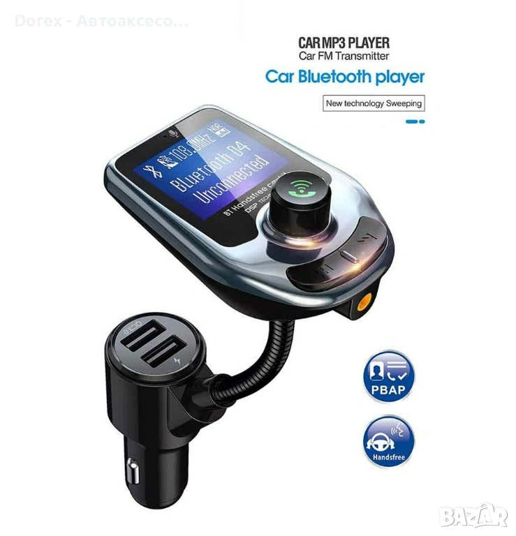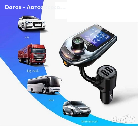 Bluetooth FM трансмитер за кола с MP3 плейър и функция за хендсфрий подходящ за възпроизвеждане на музика и провеждане на разговори по време на шофиране. Устройството се свързва безжично чрез Bluetooth и предава звука към автомобилното радио чрез FM честота без нужда от допълнителни инсталации.