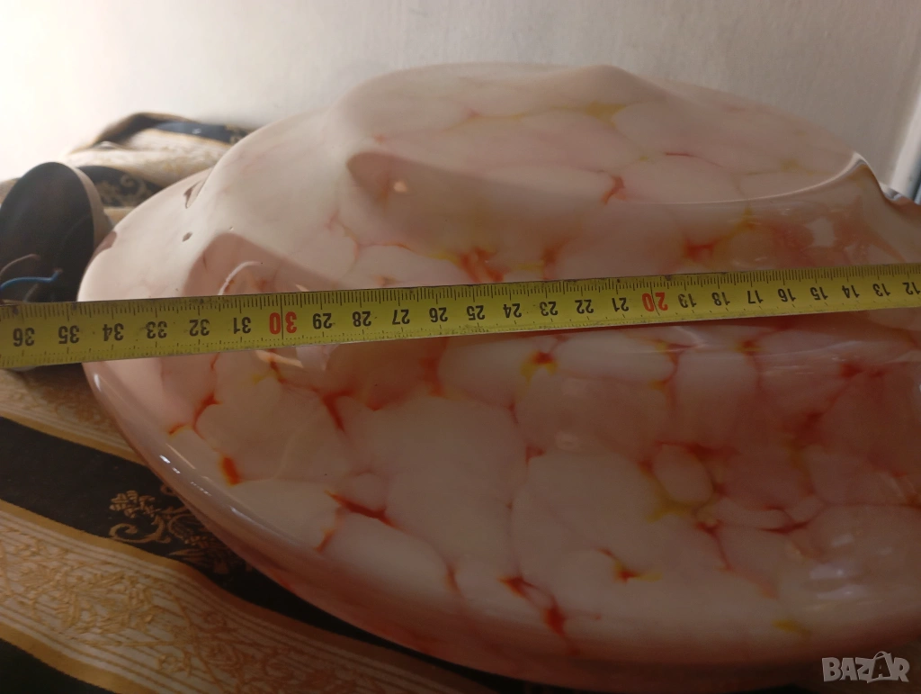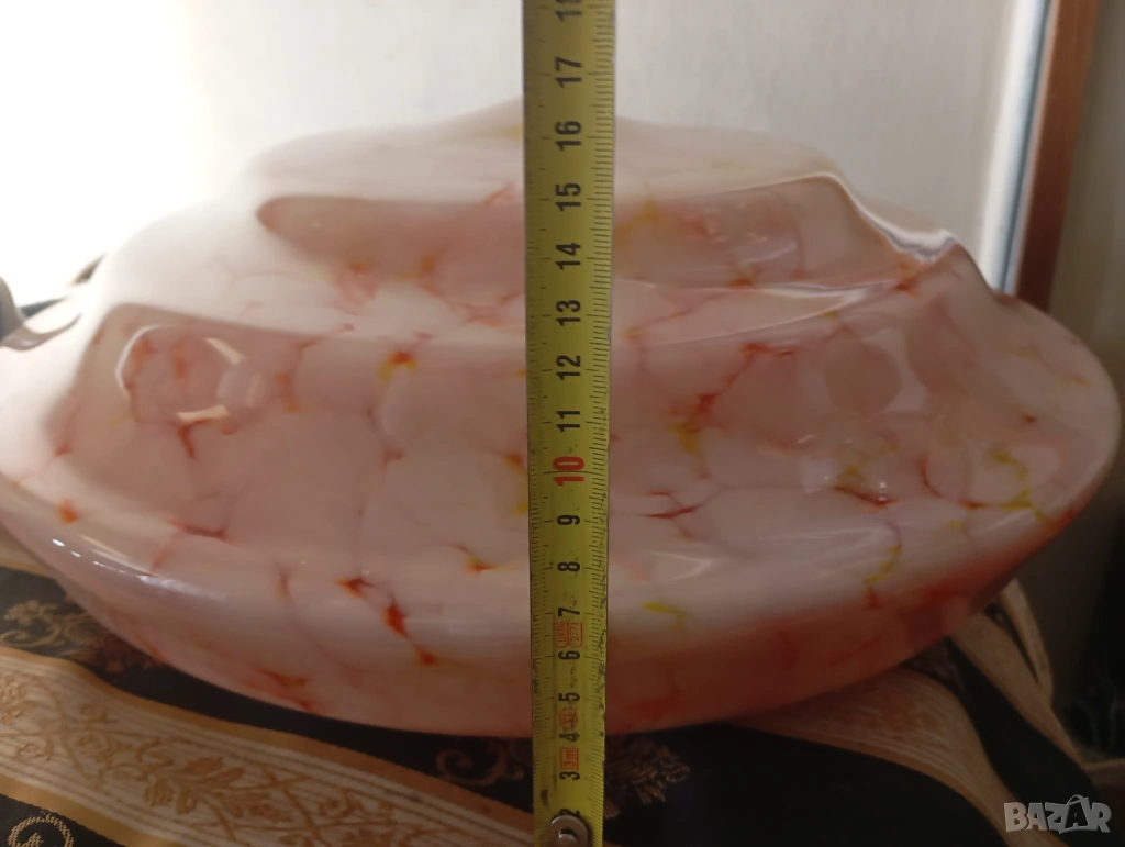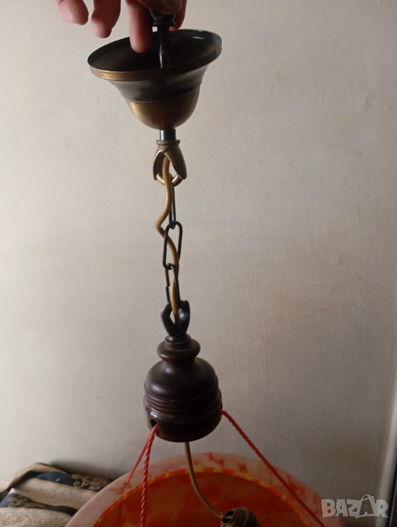 Стъклен абажур с метален корпус.Месингова фасунга.Дължината може да се регулира.