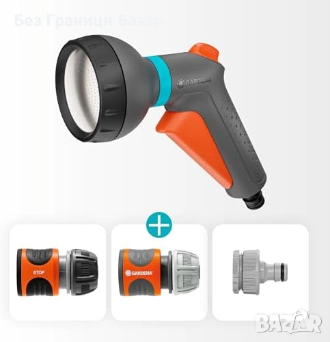Комплектът съдържа разпръсквач, адаптер за кран, конектор за маркуч и воден стоп