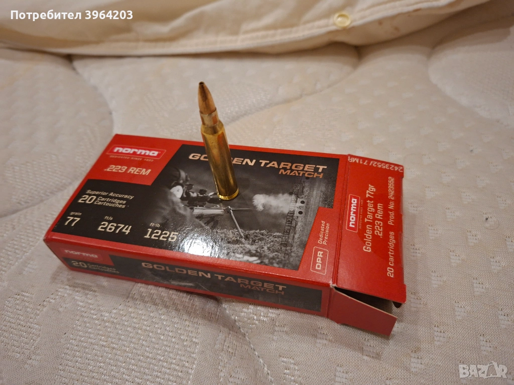 Продавам патрони в кал.223 Rem, "NORMA GOLDEN TARGET MATCH" - 77gr. 100 бр. Цена за насипно - 0,95 евро за брой, ако се купят всички накуп - 0,85 евро за брой. Давам ги срещу разрешително за калибъра. Тел.0882252522. Местонахождение - София.
