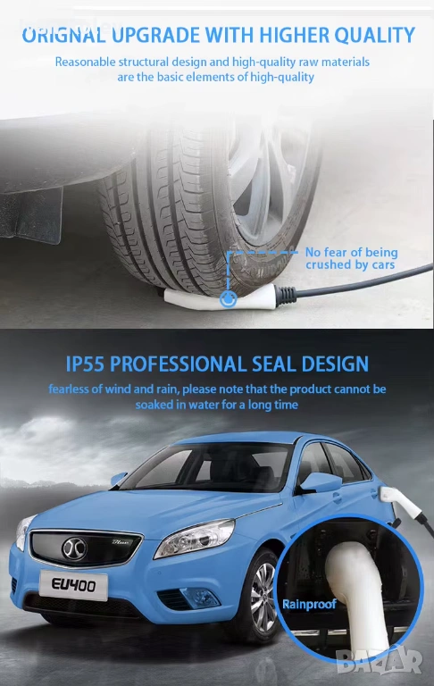 Зарядният кабел отговаря на най-новите изисквания на EN стандарта за кабели за зареждане на електрически превозни средства. Високоустойчив на студ и топлина,
