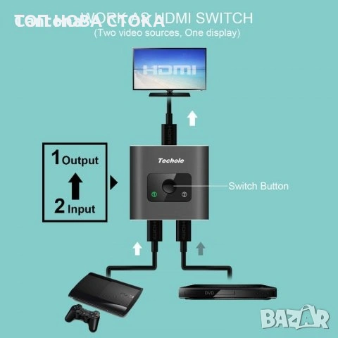 информация Този HDMI превключвател е лесен за настройка и работа. Не е необходимо външно захранване, просто свържете вашите HDMI устройства, за да се насладите! Просто натискане на бутон за размяна на сигнала в рамките на една секунда и LED светлината ви казва кой порт е активен. Забележка: Има защитен филм върху продукта, който лесно би оставил следа върху него. Просто го премахнете преди употреба. Конструкция от масивна алуминиева сплав, издръжлив HDMI двупосочен сплитер на Techole ви помага да свържете два HDMI източника към един HDMI дисплей или да свържете един HDMI източник, за да превключвате между два дисплея ✅два екрана НЕ МОГАТ да показват едновременно✅ HDMI превключвателят осигурява предаване на данни с висока честотна лента 10.2Gbps, стандартната дължина на кабела за вход и изход AWG26 HDMI може да достигне до 5 метра. Без забавяне, без загуба на качество на картината или звука. ✅HDMI кабел НЕ е включен. ✅ Поддържа 3D, 1080P, 4K x 2K@30hz резолюция и HD аудио, с този HDMI превключвател можете да се насладите на най-луксозното видео и аудио. (Моля, използвайте стандартен HDMI 2.0 кабел, за да свържете вашия Xbox one) HDMI Splitter Switcher, подходящ за повечето устройства със стандартен HDMI интерфейс. Вход: компютър, XBox 360, XBox One, PS3 / PS4, Blu-Ray DVD плейър, Route Roku, Chromecast, компютър и др. Изход: HD-Ready, Full HD телевизори, телевизори, монитори, проектори и др.