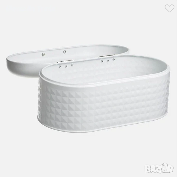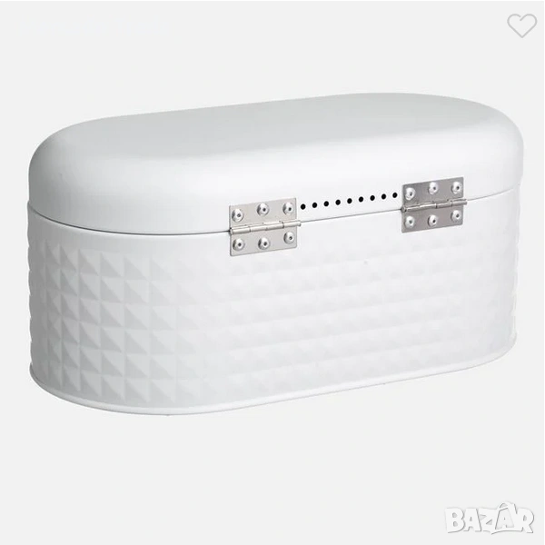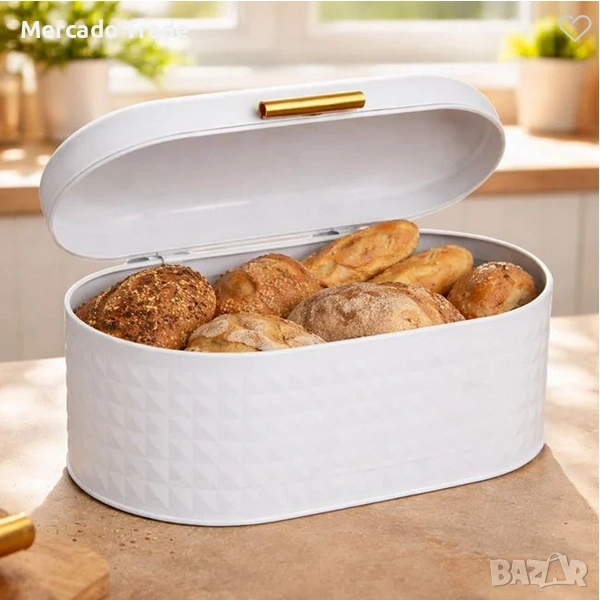Метална кутия за хляб Mercado Trade в овална форма в бял цвят. Има релефна повърхност и капак, който се отваря нагоре със златиста матова дръжка. Помага да съхранявате хлебните изделия и сухарите свежи и плота ви чист. Придава нотка лукс на вашата кухня!