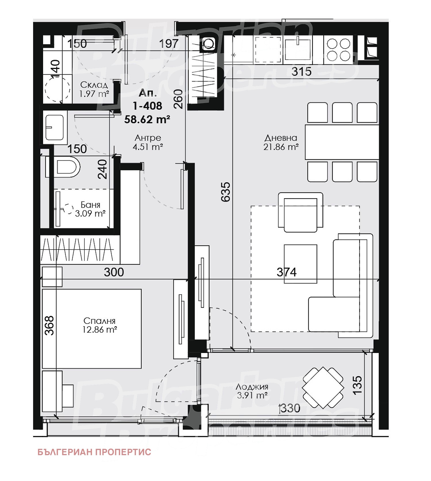 Апартаментът е с нетна площ от 58.62 кв.м и обща площ от 69.47 кв.м, със светло източно изложение. Разпределението е функционално и удобно: