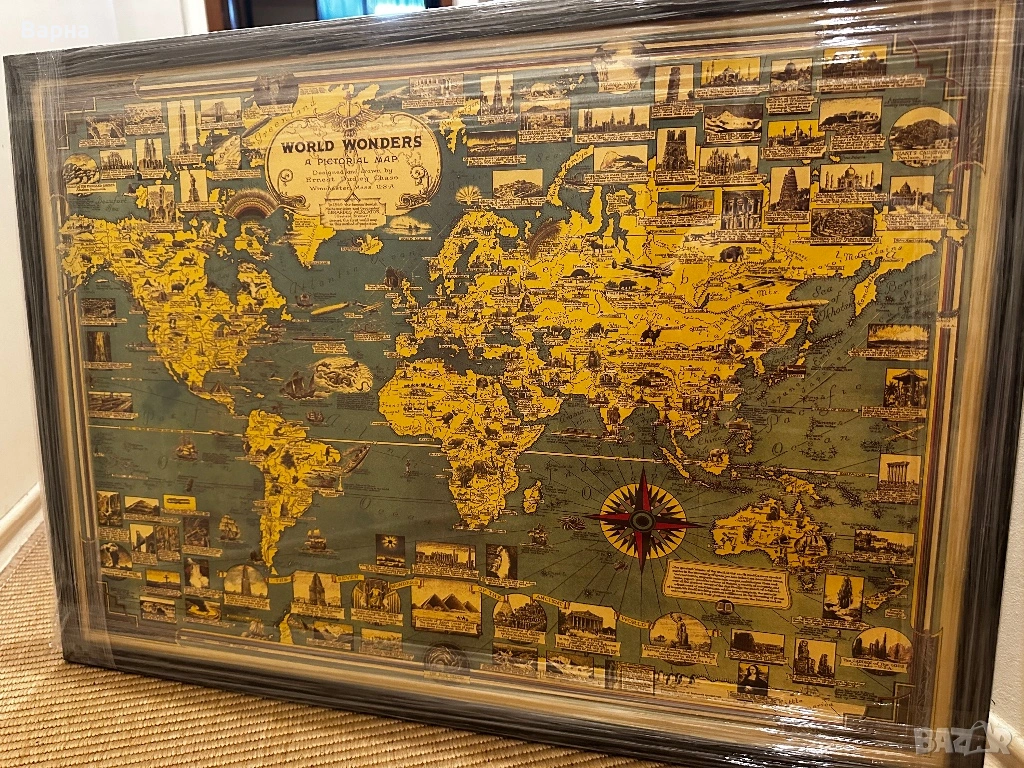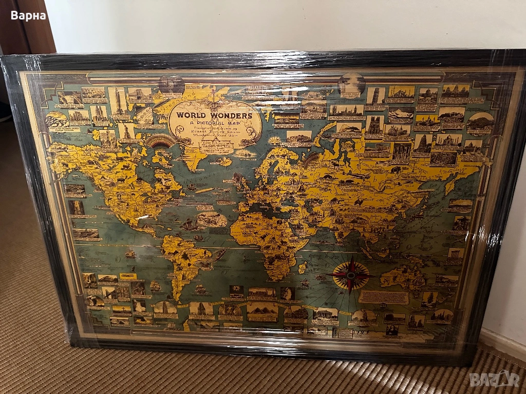 Карта на света със забележителностите. Рамка по поръчка, с поставен гръб, кукички гумени крачета. Подходяща за дома, офиса или за подарък.