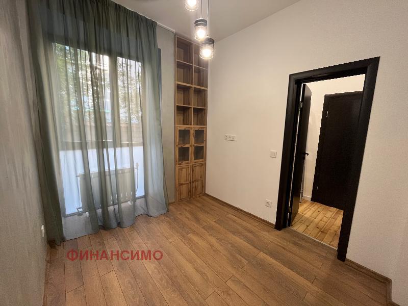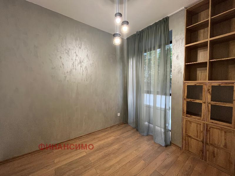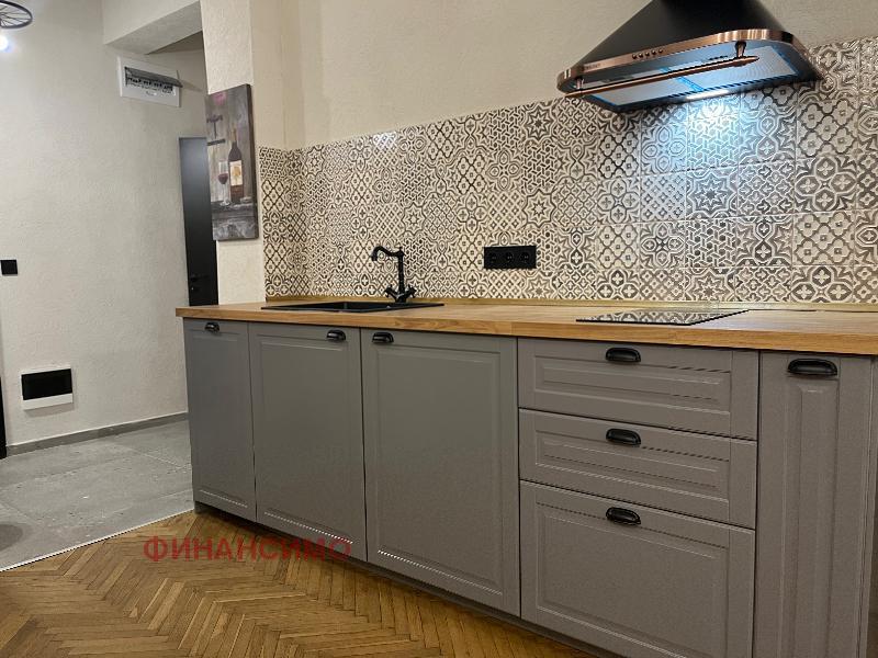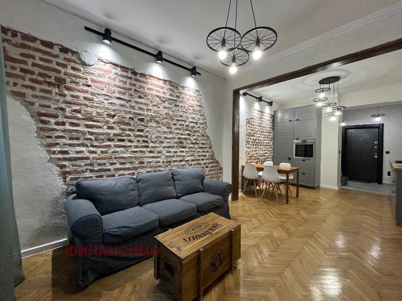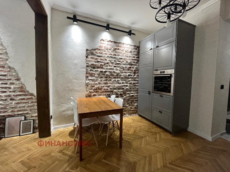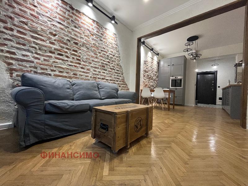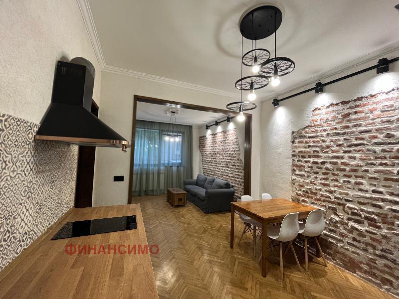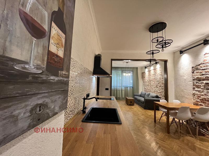 For rent a stylishly furnished, renovated three-room apartment on a quiet street in close proximity to the 'Printing Plant' and the 'Borisova Garden'. With its high ceilings and spacious rooms in combination with a contemporary design, the apartment offers urban comfort with an aristocratic spirit. Its layout is: entrance hall, living room with kitchen and dining room, transition to a wardrobe, which serves two bedrooms, bathroom with toilet. Kitchen, with built-in dishwasher, washing machine with dryer, oven, refrigerator and high-class hobs. The flooring in the apartment is natural oak parquet and granite tiles. The heating of the property is with central heating, and air conditioning has been added in the living room. The apartment awaits its tenants, with the second bedroom being further furnished according to their needs.
