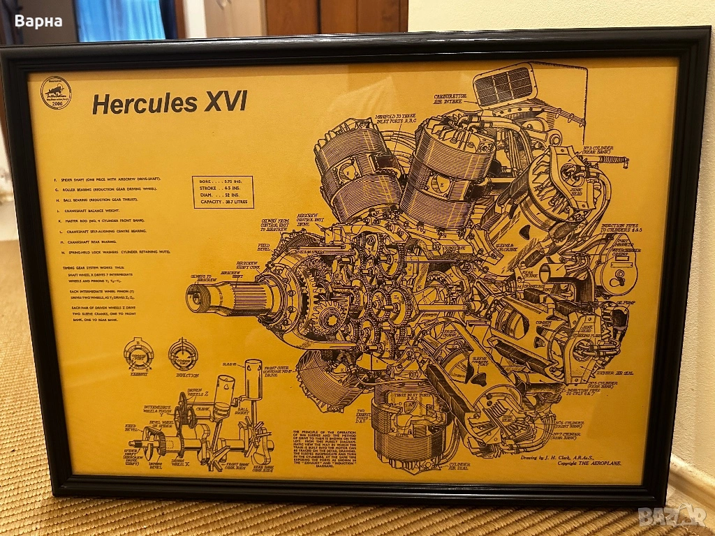 Постер /плакат картина/ Двигател Херкулес 16. Поставена рамка по поръчка, стъкло, гръб и кукички. Подходяща за дома, офиса или подарък.