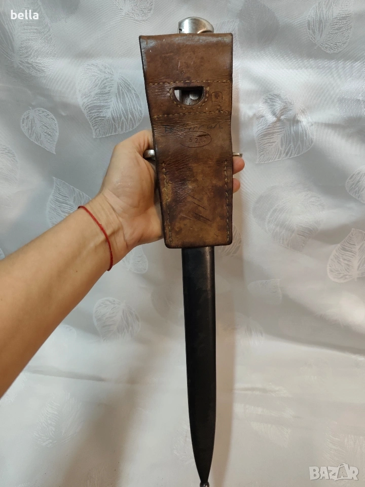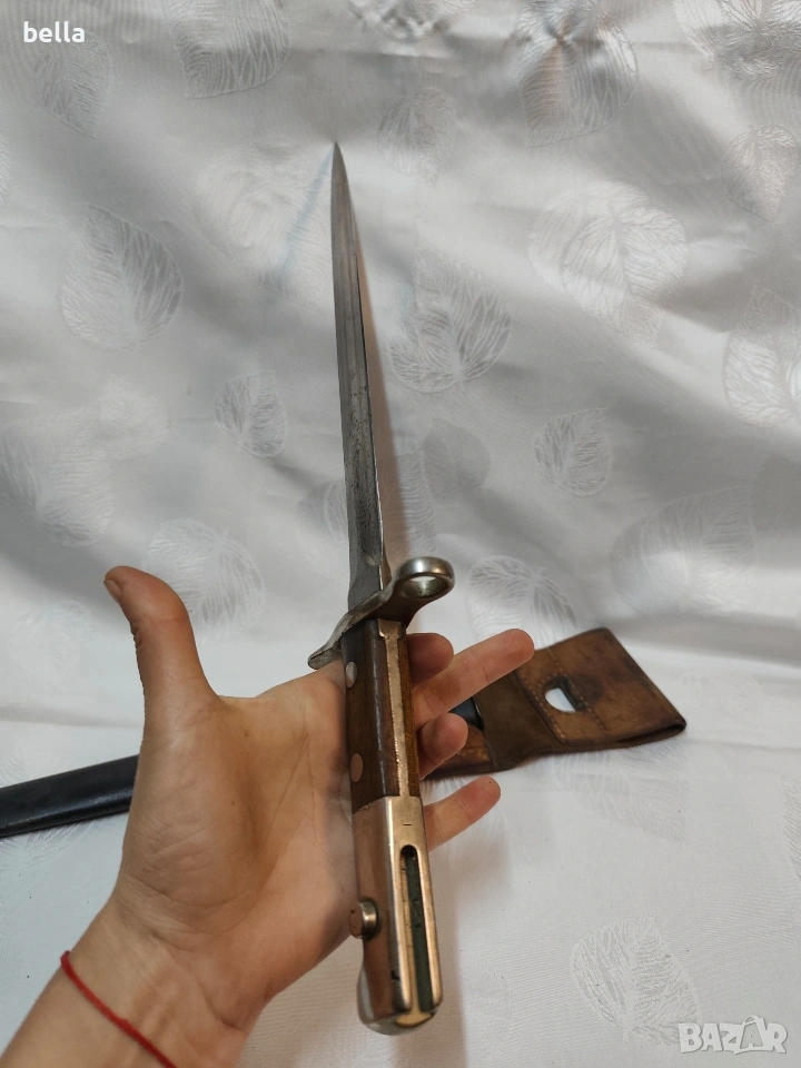 Автентичен швейцарски щик модел 1918 г. Това е емблематично хладно оръжие, произведено от Elsener Schwyz (старото име на легендарните Victorinox). Щикът е предназначен за карабини K11 и K31 и е изключително ценен заради своята прецизна изработка и историческа стойност. Право, двуостро острие , в добро състояние с видими маркировки на производителя "ELSENER SCHWYZ". Ръкохватка: Оригинални дървени чирени, закрепени със стоманени нитове. Металните части са със запазен финиш. Сериен номер: Ясно видим номер на гарда (22932), което позволява на колекционерите да проследят годината или частта. Оригинална стоманена кания с характерната "пъпка" на върха, без големи вдлъбнатини. Кожен подвес: Много рядък и ценен елемент – оригинален кожен държач с катарама, който е в отлично функционално състояние за годините си.Цена 150 евро