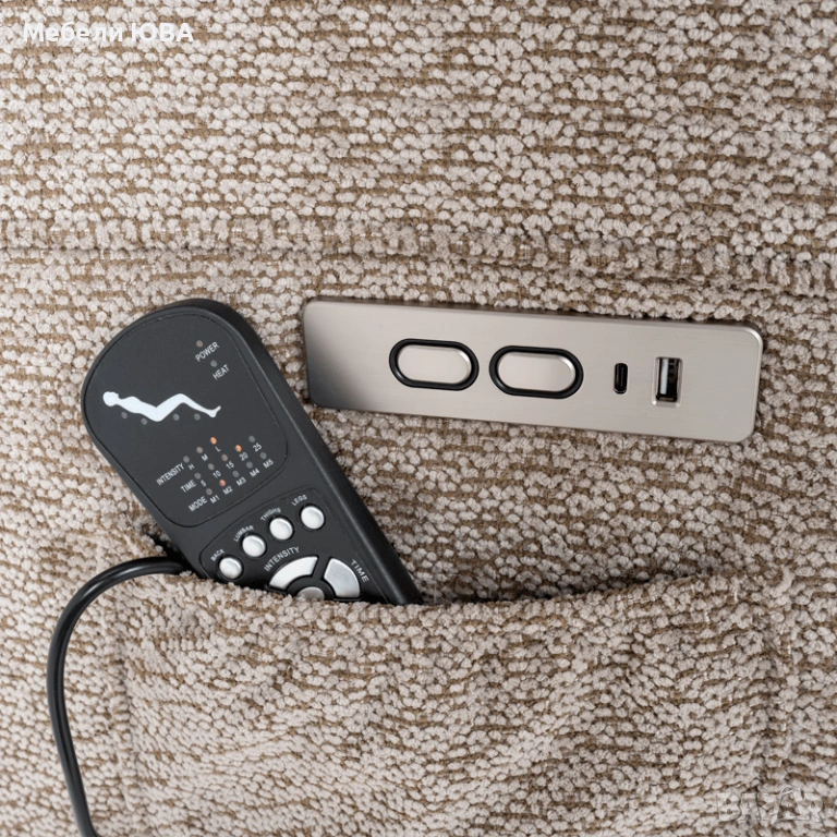 Допълнително удобство осигуряват вградените USB и Type-C портове за зареждане на мобилни устройства, разположени в страничния панел, както и практичният страничен джоб за дистанционното управление.