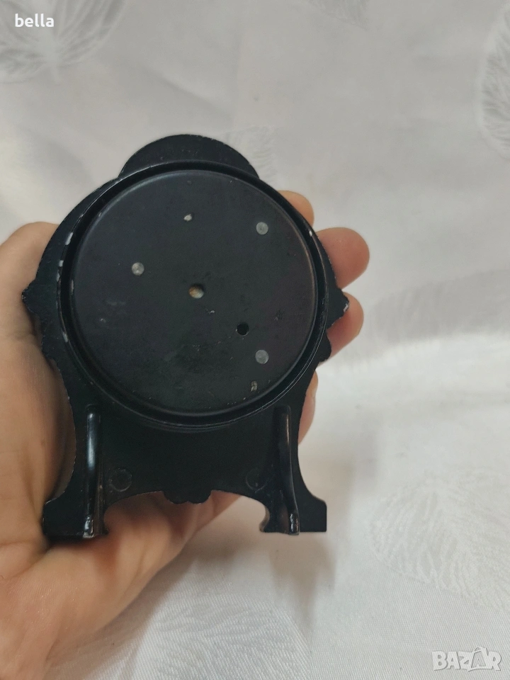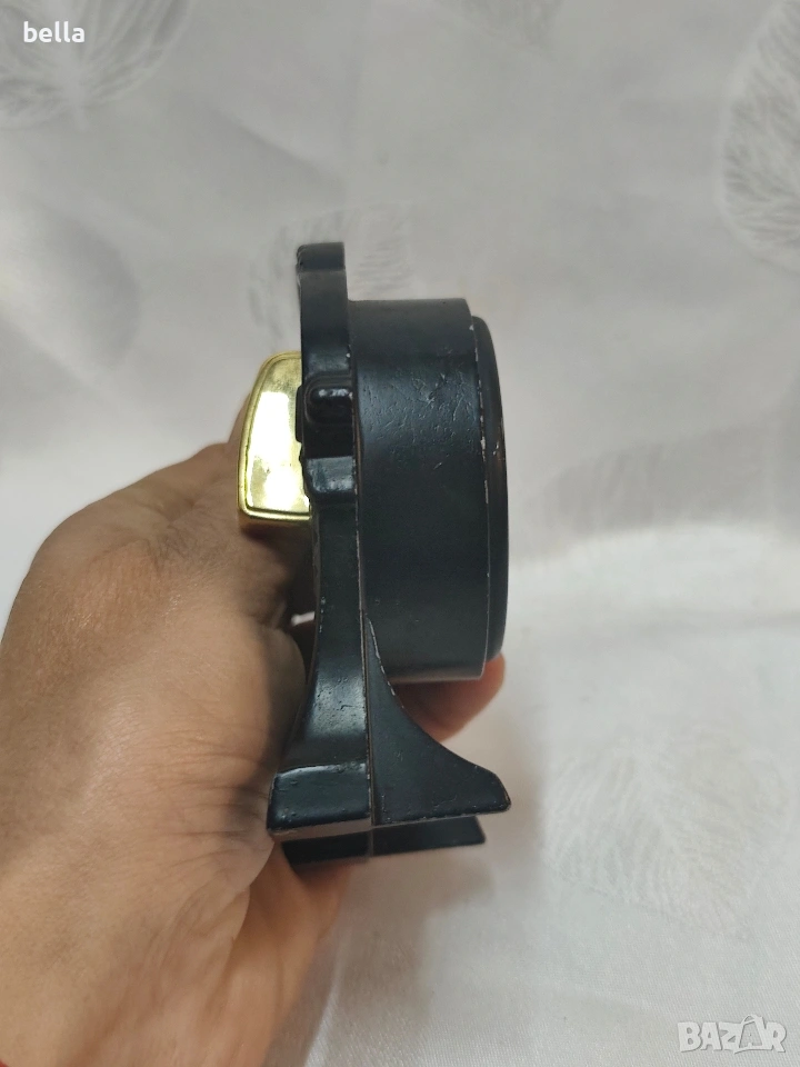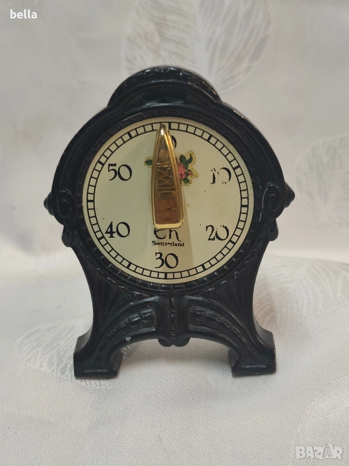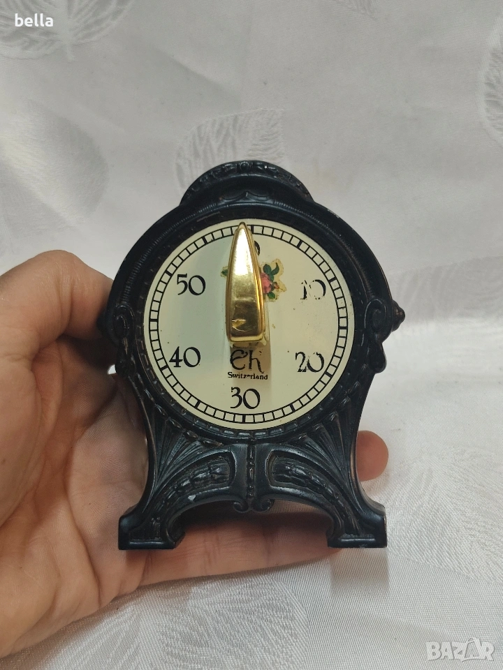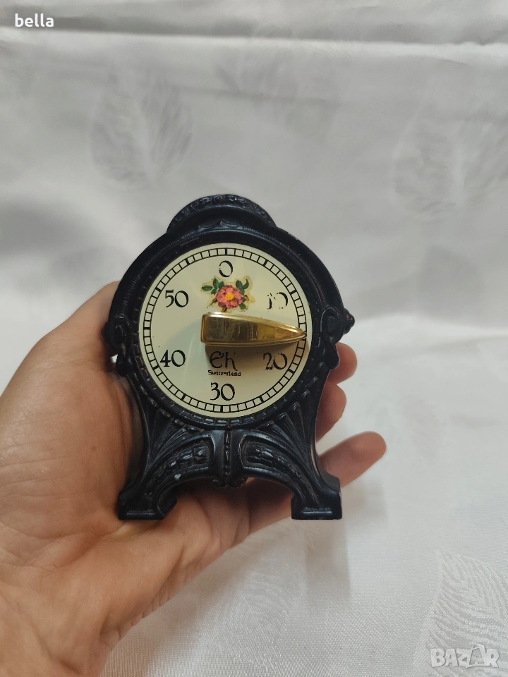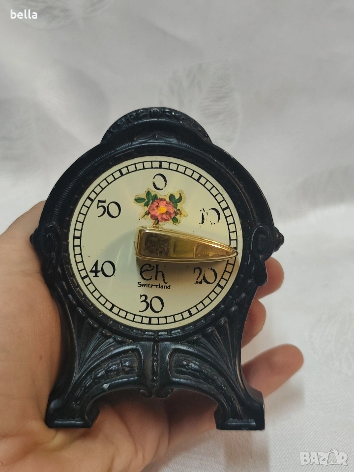 Антикварен чугунен Швейцарски Кухненски Таймер Арт Деко – Марка "EH Switzerland" Продавам прекрасен антикварен кухненски таймер, изработен в Швейцария през първата половина на XX век (около 1930-1940 г.). Предметът е в автентичен Арт Деко стил и е перфектен както за декорация, така и за колекция.Работещ в прекрасен вид Ясно видим надпис "EH Switzerland" на циферблата, което гарантира качеството на швейцарския механизъм. Циферблатът е в кремав цвят с ретро черни цифри от 0 до 50 (минути).Цена 80 евро