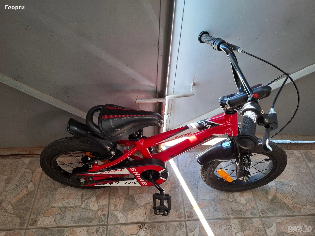 Продавам детски велосипед Byox Shine-14цола с предна и задна спирачка,калници,монтирана допълнителна сирена.Изключително запазено с минимални следи от употреба,карано е само от едно дете!Здраво и качествено колело,възможност за поставяне на помощни колела по желание.Цена 75евро