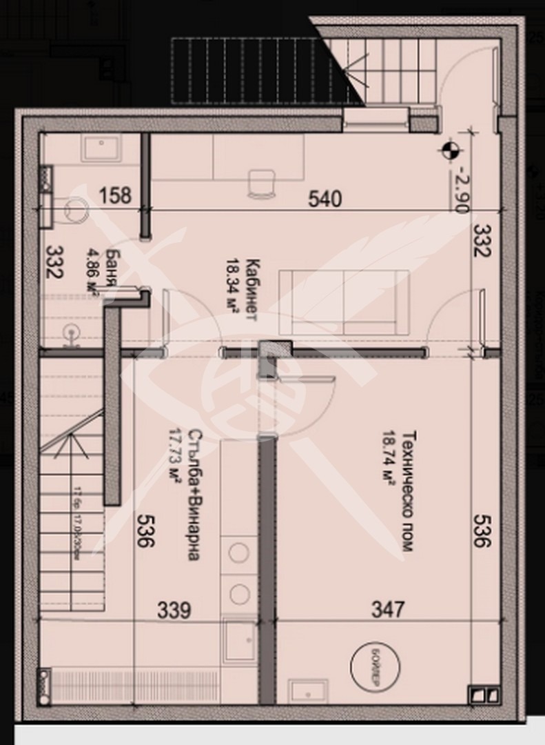 Сутерен: кабинет, баня с тоалетна, винарна и склад;