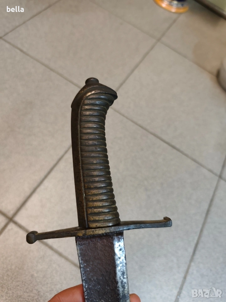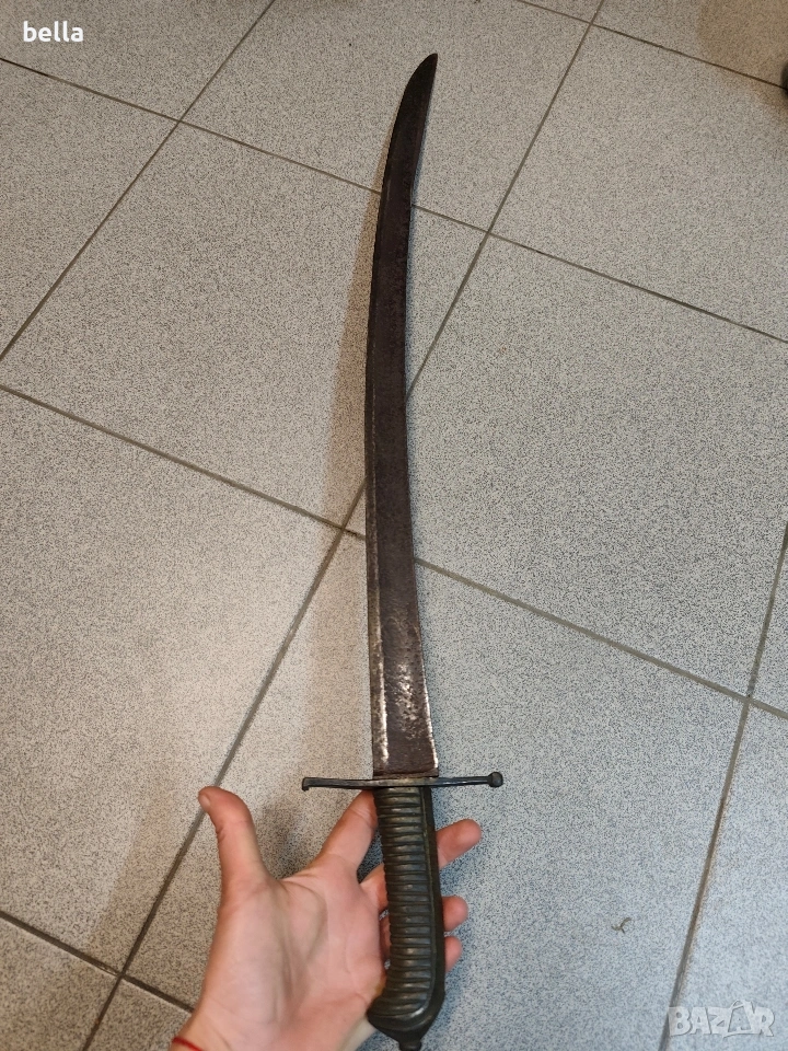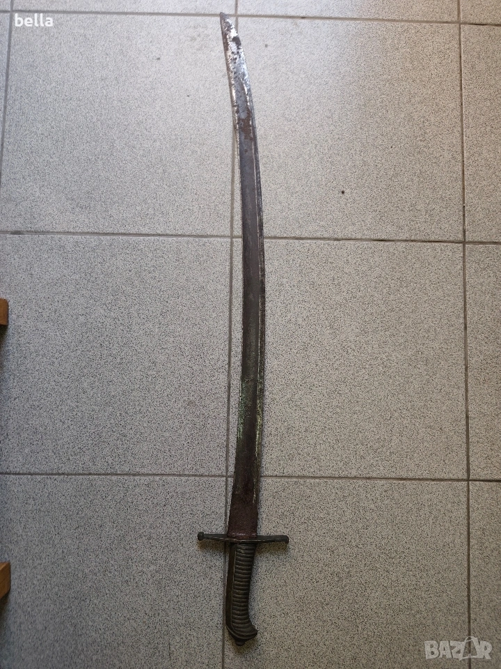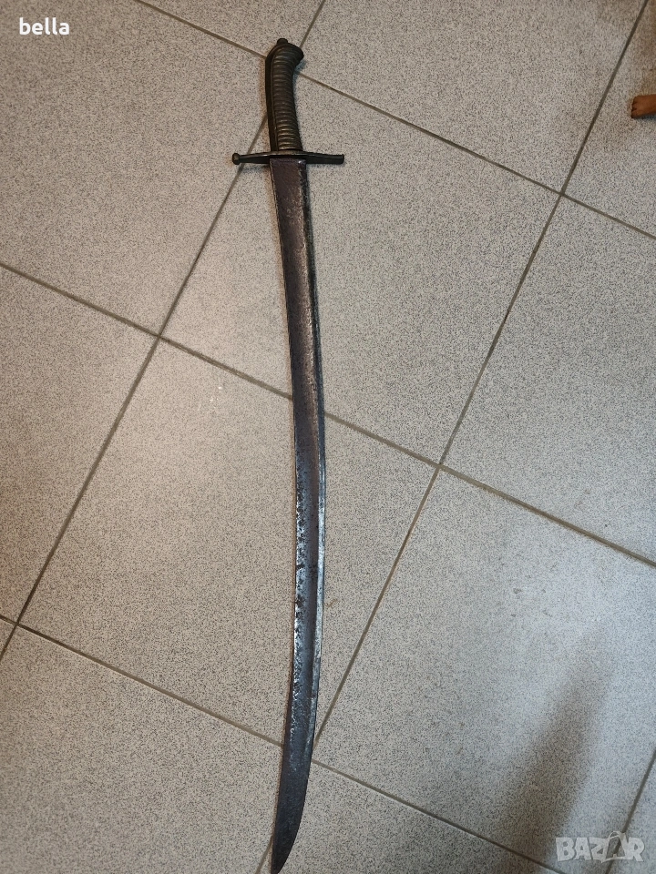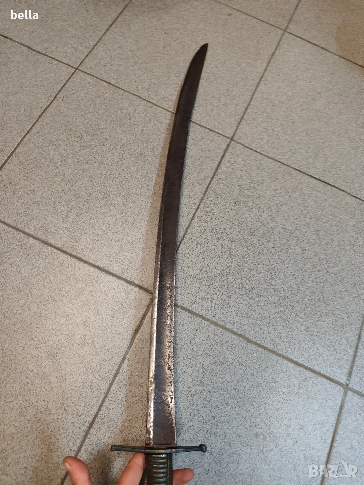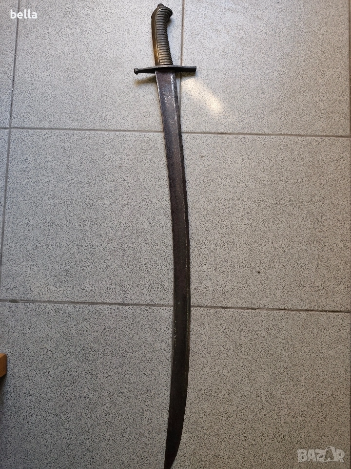 Автентична френска пехотна офицерска сабя, модел 1795 г. Предметът е със запазени оригинални характеристики и е отлична инвестиция за колекционери на хладно оръжие. Технически детайли: Острие: Дължина -69-70 см, масивно. Налична е оригинална офицерска гравюра (ецване) по стоманата. Дръжка: Излята от масивен бронз с напречни ребра. Гард: Автентична бойна модификация (скъсен), извършена в миналото. Патината по местата на модификацията е идентична с тази на целия гард, което гарантира старинния произход на промяната. Солидна конструкция без луфтове. Благородна патина по метала, доказваща възрастта на предмета. Цена: 300 евро