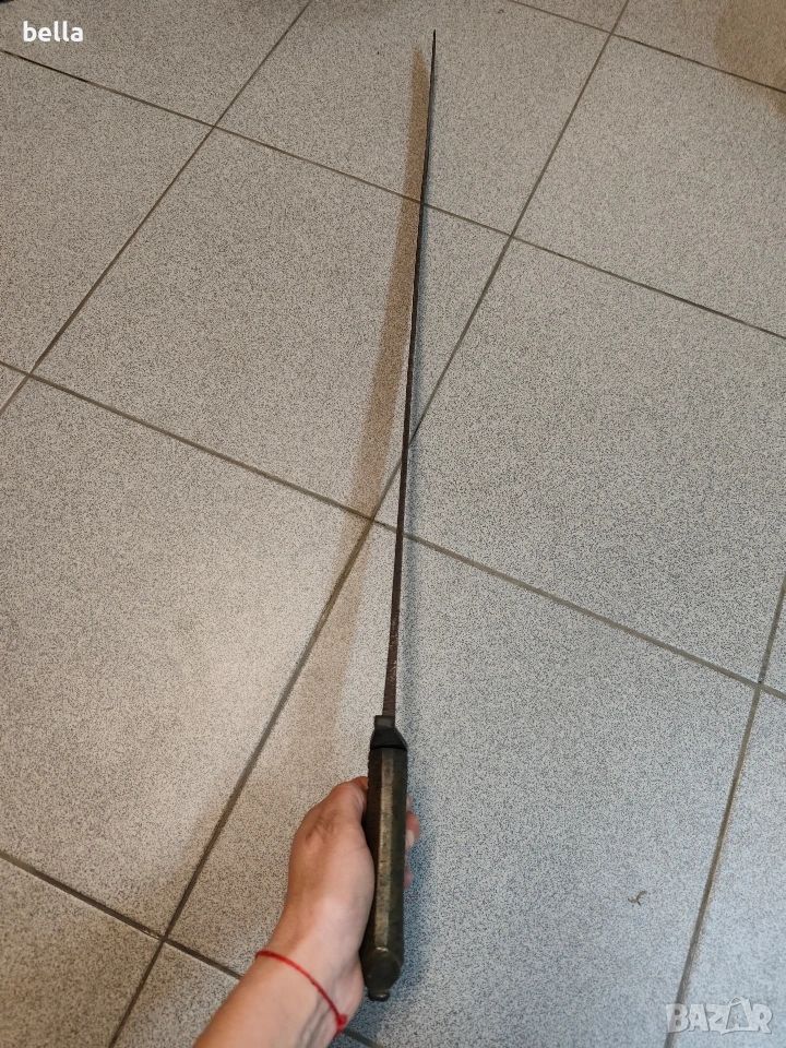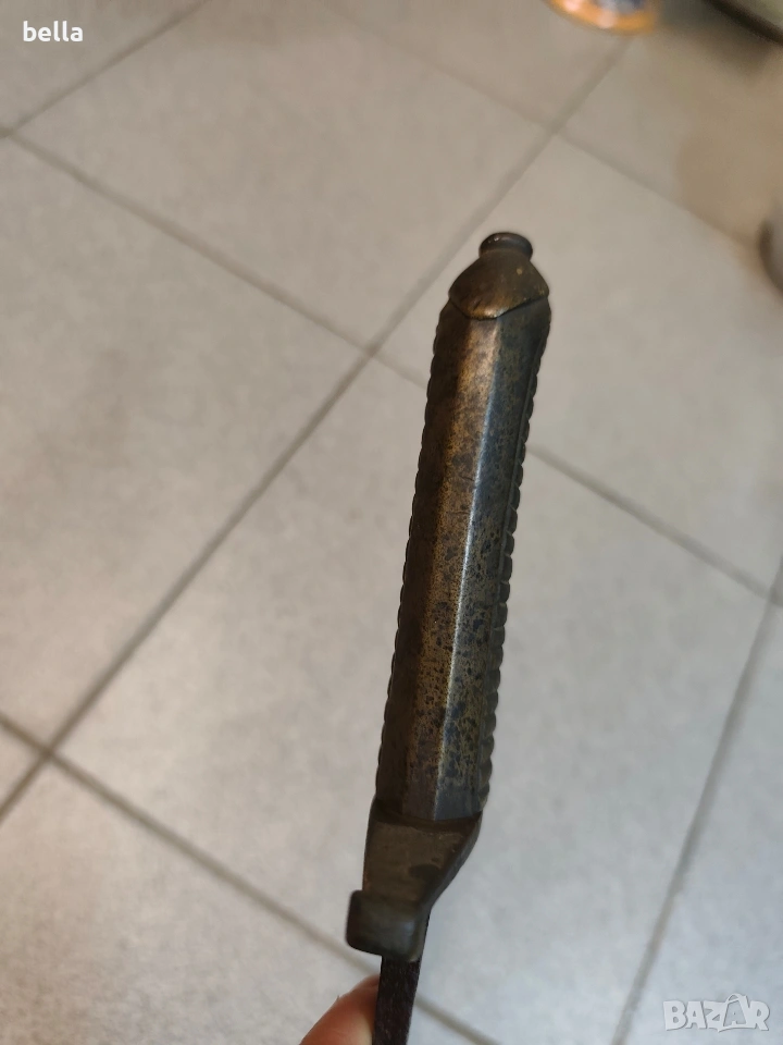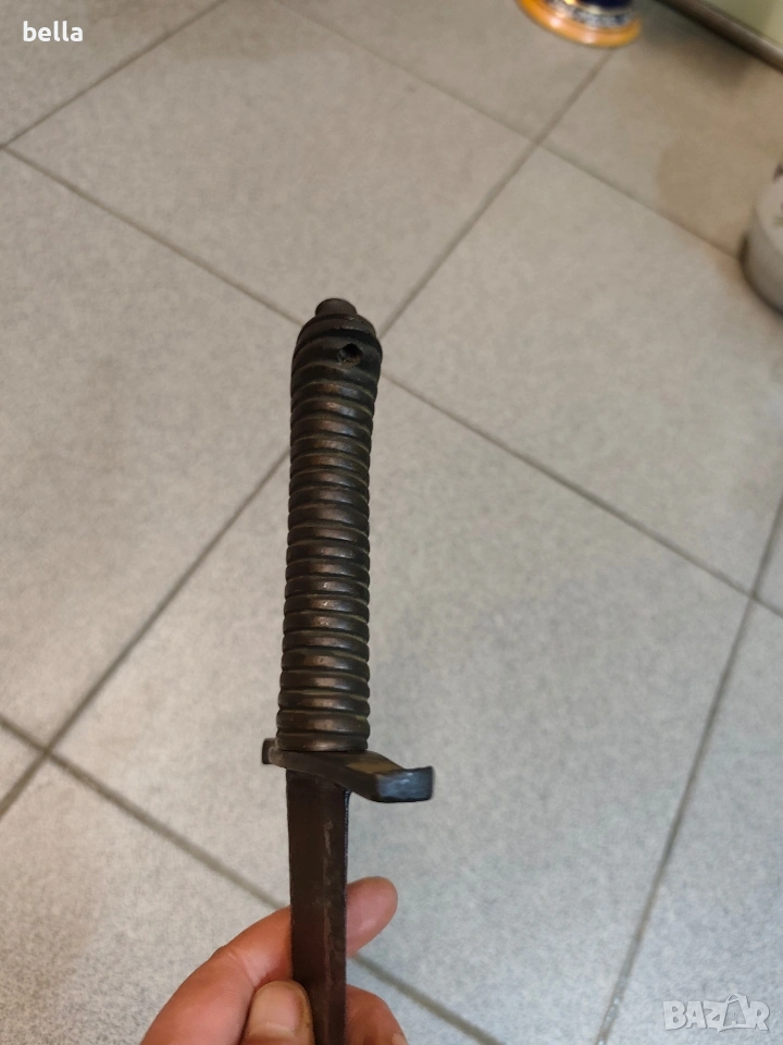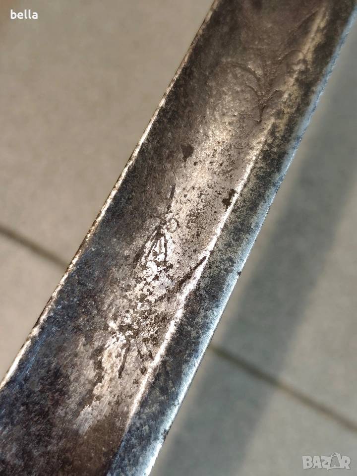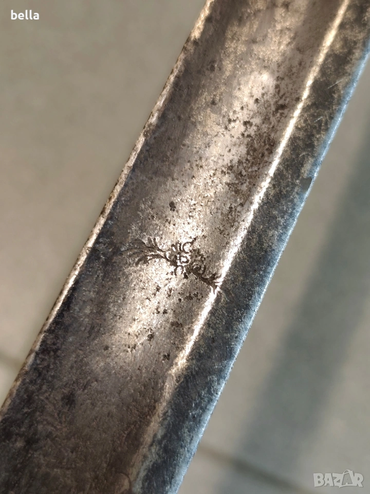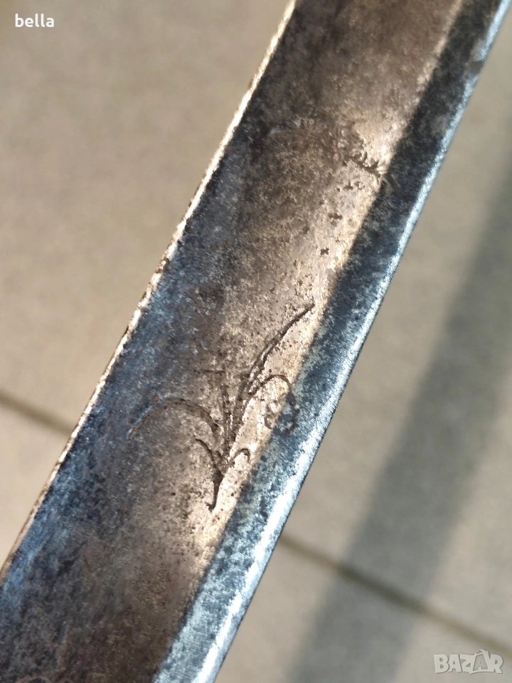 Автентична френска пехотна офицерска сабя, модел 1795 г. Предметът е със запазени оригинални характеристики и е отлична инвестиция за колекционери на хладно оръжие. Технически детайли: Острие: Дължина -69-70 см, масивно. Налична е оригинална офицерска гравюра (ецване) по стоманата. Дръжка: Излята от масивен бронз с напречни ребра. Гард: Автентична бойна модификация (скъсен), извършена в миналото. Патината по местата на модификацията е идентична с тази на целия гард, което гарантира старинния произход на промяната. Солидна конструкция без луфтове. Благородна патина по метала, доказваща възрастта на предмета. Цена: 300 евро