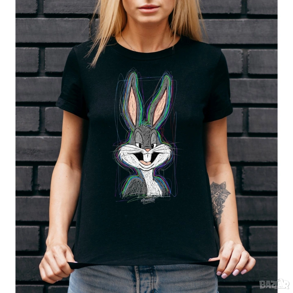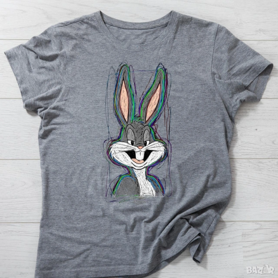 Бъгс Бъни мъжка, дамска, детска тениска, памучна фланелка, заек, черно, бяло, сиво, щампа → Обява 54113454