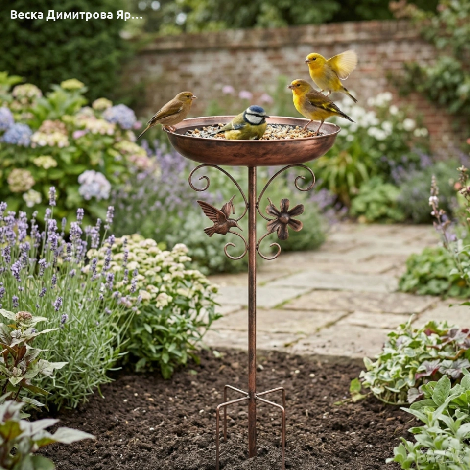 Технически характеристики на Метална градинска поилка и хранилка за птици 2-в-1 с декоративни елементи и стабилна основа Подробни размери и материали, които гарантират безпроблемна употреба и дълготрайност: Обща височина: около 80 – 81.3 см (31.5 – 32 инча), регулируема чрез секции. Диаметър на чинията: около 30 см (11.8 - 12 инча). Дълбочина на чинията: приблизително 5 см (2 инча) — безопасна дълбочина за малки птици. Материал: устойчив метал с антично медно покритие — защита срещу ръжда и атмосферни влияния. Основа: 5 шипа за забиване в почвата за максимална стабилност. Монтаж: модулна, навиващи се секции за лесен монтаж и поддръжка. Подходящо за: градински аксесоари, поилки за птици, хранилки за птици, външни пространства.