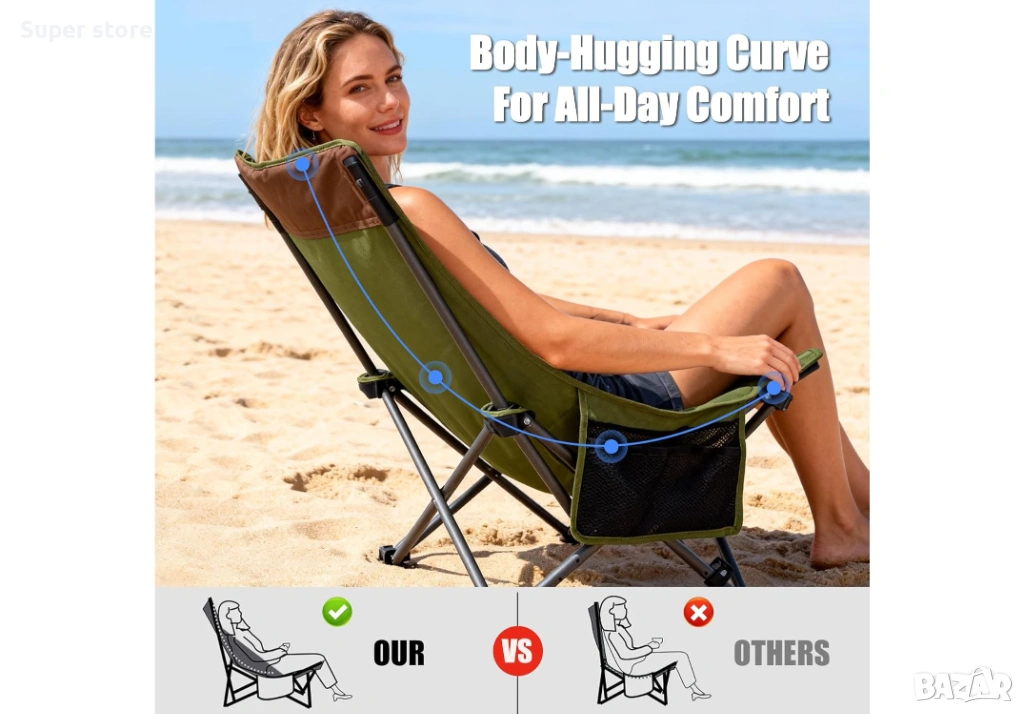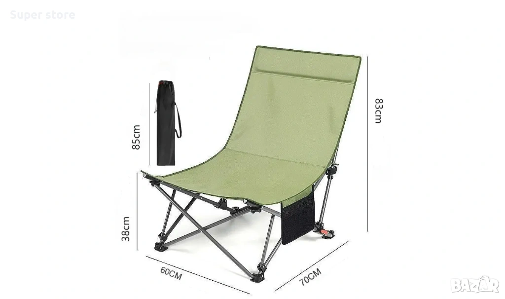 Практичен страничен джоб позволява съхранение на лични вещи като телефон, книга или аксесоари. Столът се сгъва бързо и компактно, което го прави идеален за транспорт и съхранение.