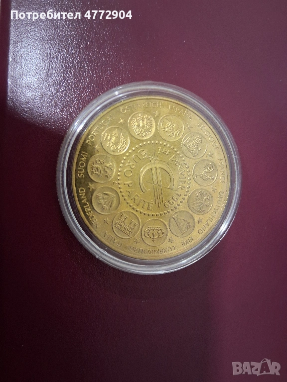 Kолекционерска монета/плакет/медал отбелязваща създаването на еврото през 1999 г., като на нея са изобразени символите на страните-основателки.