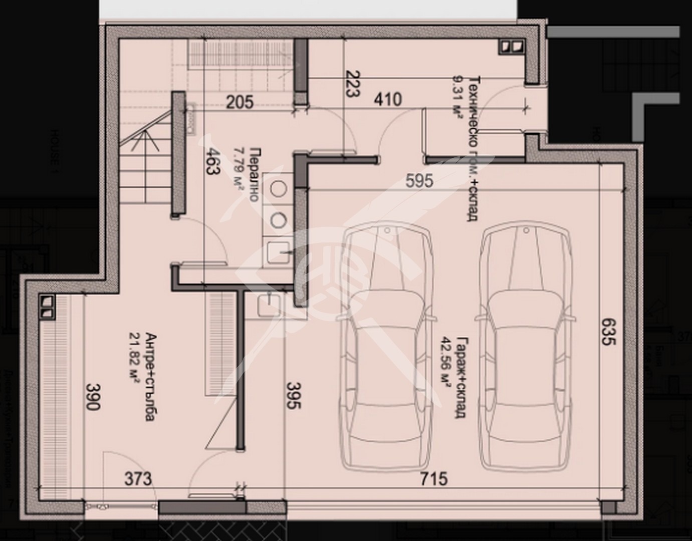Сутерен: входно антре, склад и двоен гараж;