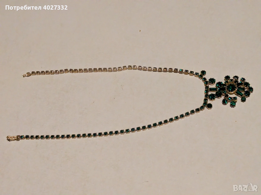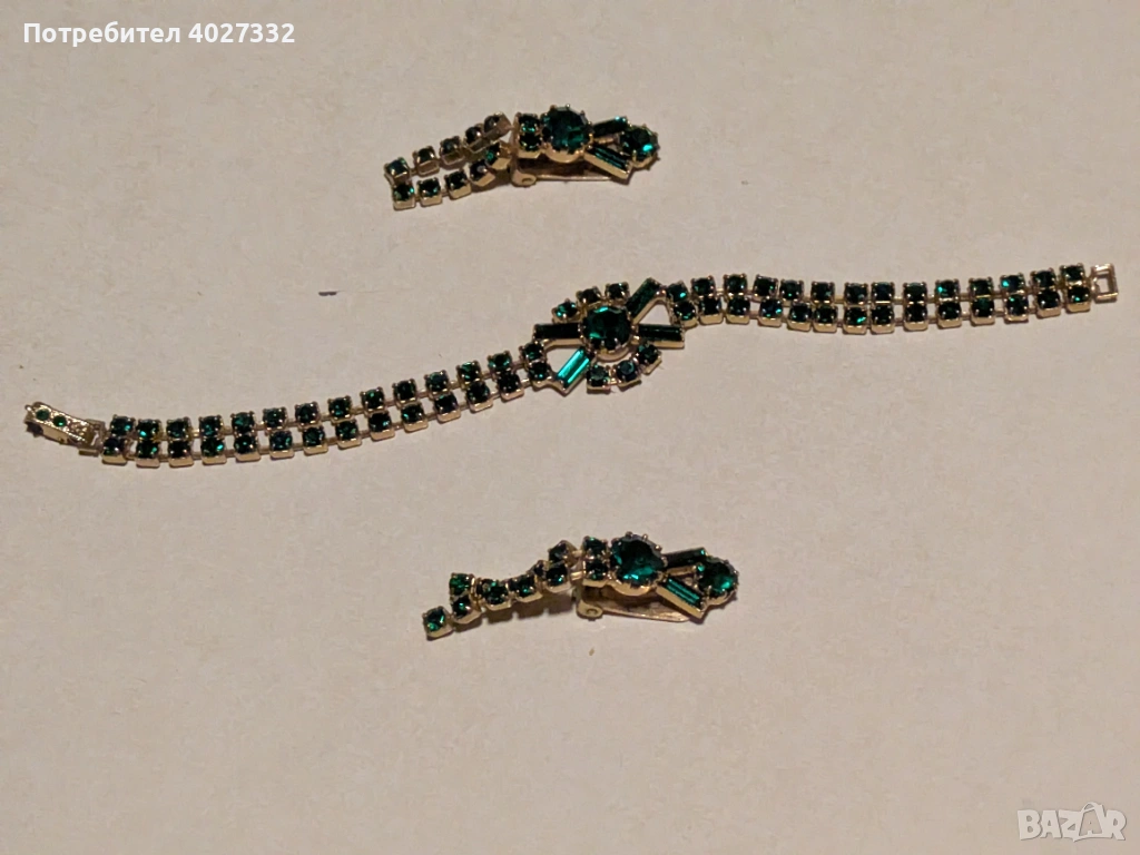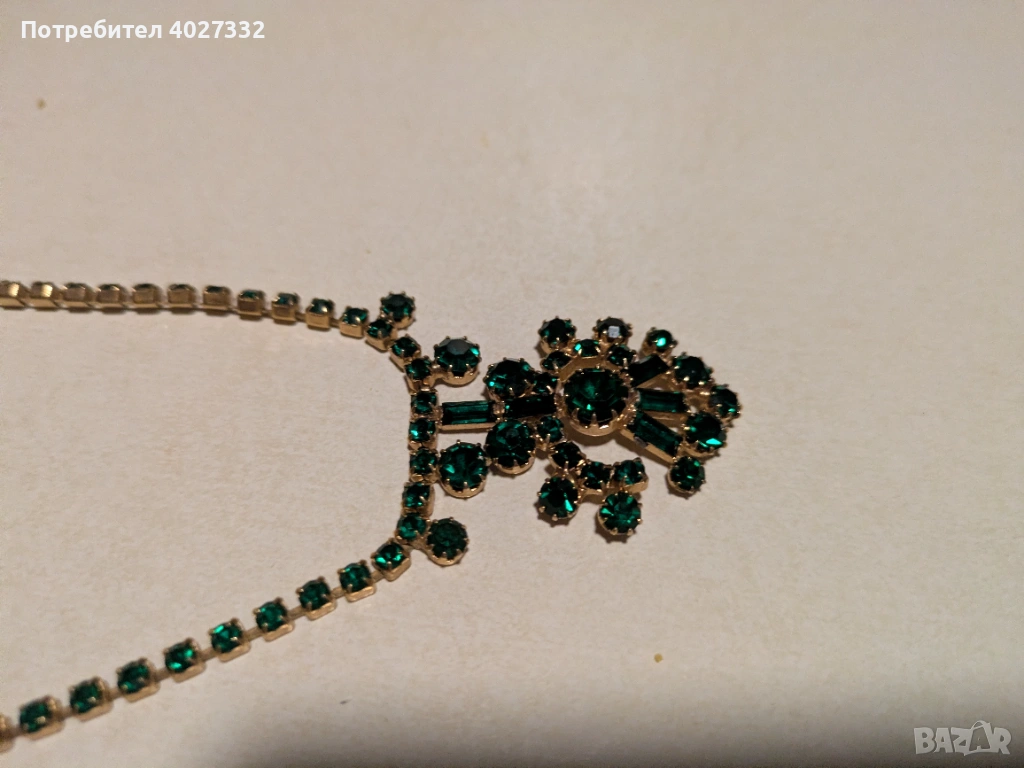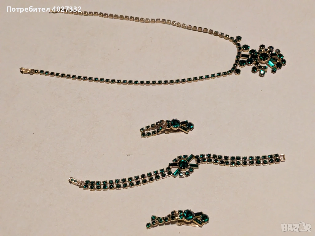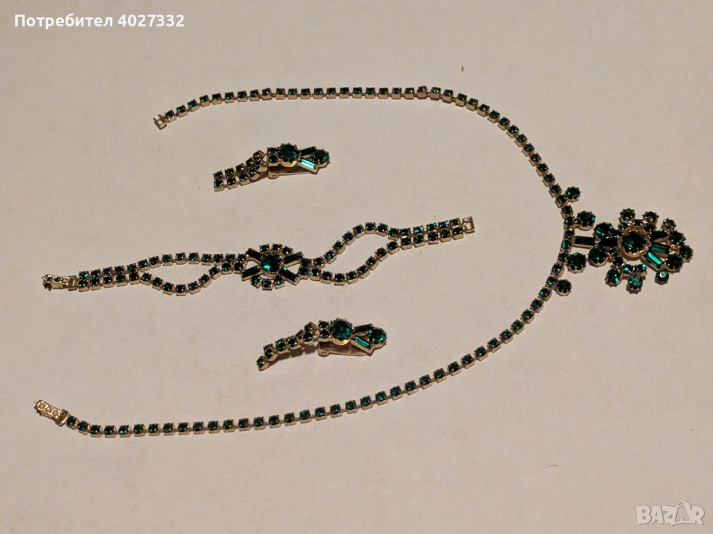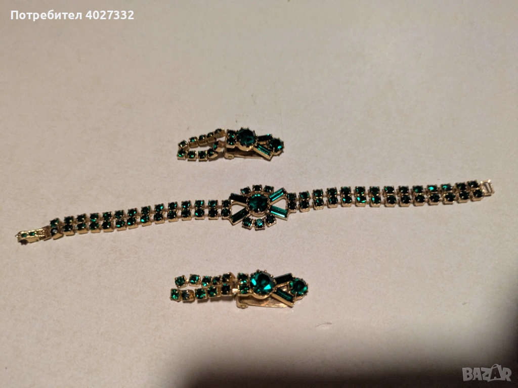 Продавам елегантен комплект бижута в златист цвят със зелени кристали.
