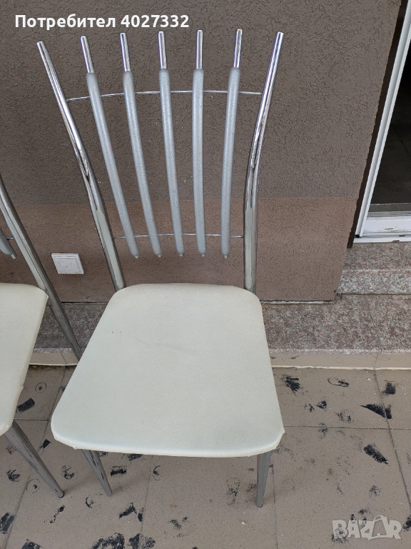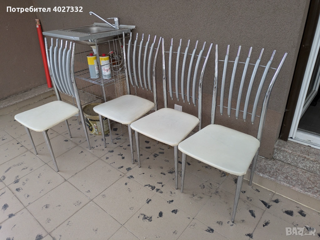 Продавам комплект 4 броя бяли кухненски / трапезни стола.Метални хромирани крака и облегалка.Употребявани — има нормални следи от ползване (виж снимките) но са стабилни и функционални.