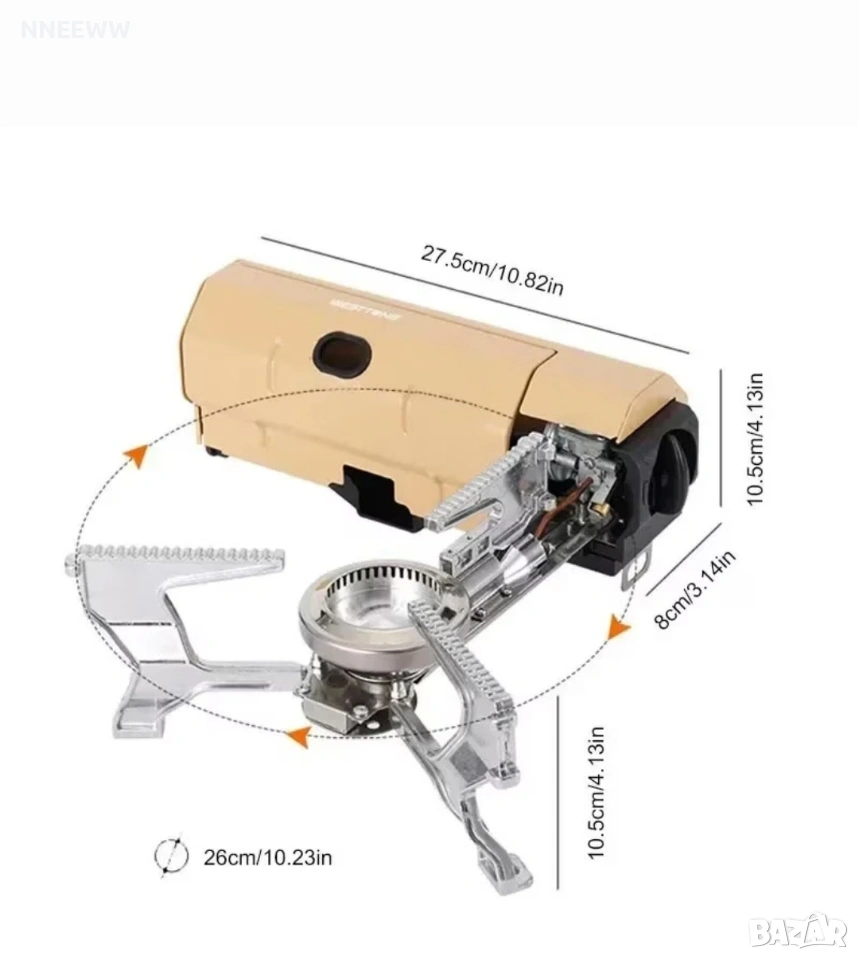 туристически" или "къмпинг" котлон), предназначен за използване на открито. Ето основните му характеристики и детайли според изображението: Основни характеристики * Дизайн: Моделът е със сгъваем механизъм, който позволява горелката и крачетата да се прибират в тялото на котлона, което го прави изключително компактен за пренасяне. * Конструкция: Изработен е от метал неръждаема стомана и алуминиеви сплави) с пластмасови елементи по корпуса. * Горелка: Централно разположена с три стабилни, назъбени рамена (стойки), които осигуряват добро сцепление с готварските съдове. Размери (съгласно диаграмата) * Дължина на корпуса: 27.5 см (10.82 инча). * Височина на корпуса: 10.5 см (4.13 инча). * Ширина на корпуса: 8 см (3.14 инча). * Диаметър на разпънатата стойка: 26 см (10.23 инча) – това позволява използването на сравнително големи тигани или тенджери. * Височина на работната част: 10.5 см (4.13 инча). Функционалност Захранване: Обикновено работи с бутилки с бутан/пропан (тип "флакон"), които се поставят в задната част на бежовия корпус. * Механизъм: Оранжевите стрелки показват как рамената и горелката се завъртат, за да преминат от състояние за съхранение към работен режим. * Употреба: Идеален за къмпинг, пикник, риболов или като резервен вариант при прекъсване на електрозахранването. Този тип дизайн стана много популярен през последните години (често наричан стил "Snow Peak" или "трансформер"), заради своята естетика и висока ефективност при пестене на място в раницата или багажника.