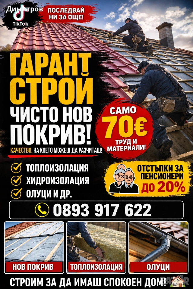 Ремонт на стари и изграждане на нова покриви, пренареждане на керемиди, керамични керемиди, бетонни керемиди, метални керемиди, битумни керемиди, отстраняване на течове, частични ремонти, Измазване и Обшиване на комини, изграждане на навесй и беседки, Доставка и монтаж на безшевни улуци, български улуци, хидроизолация, топлоизолация, Шпакловки, Бояджийски услуги, фаянс, теракот водопровод, и други СМР УСЛУГИ