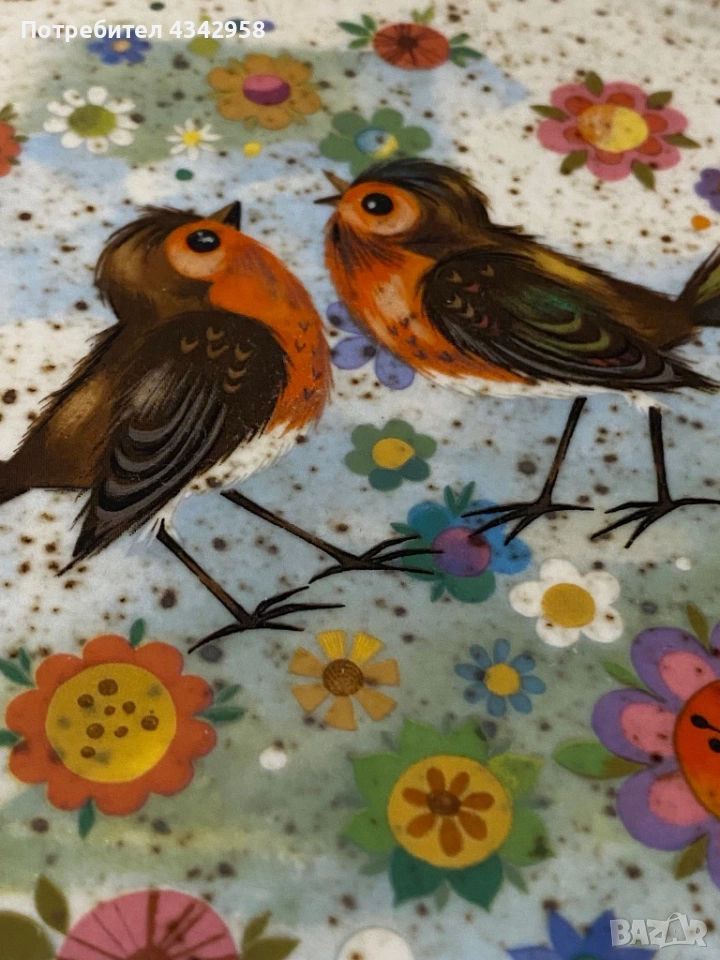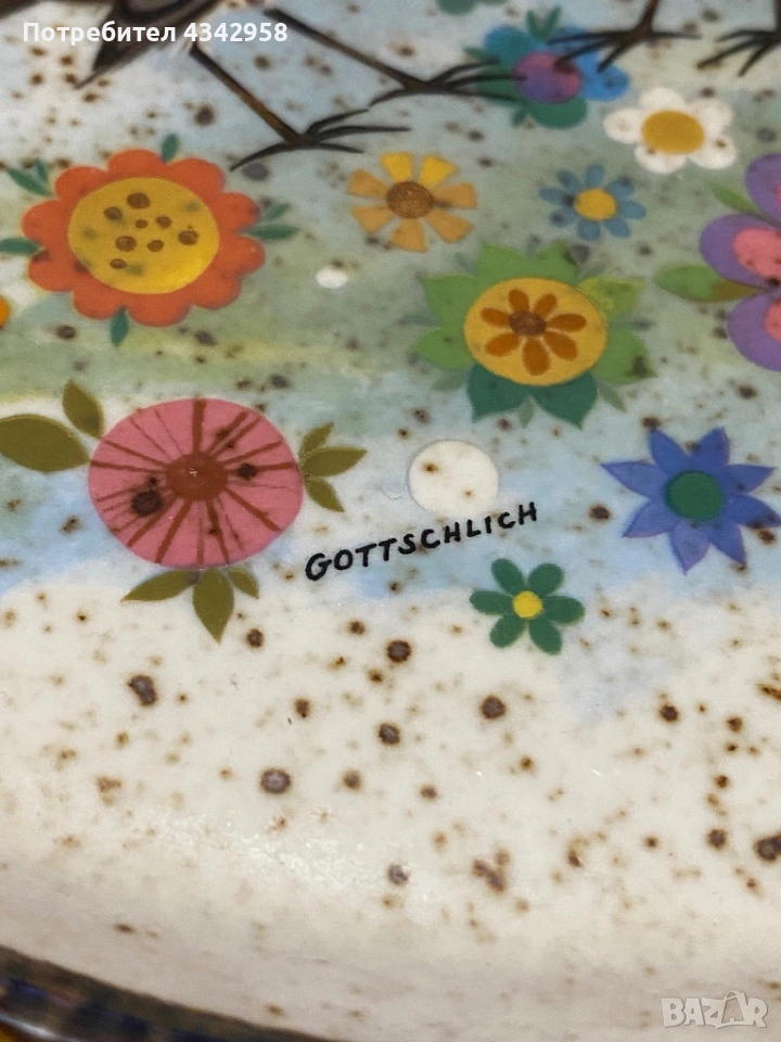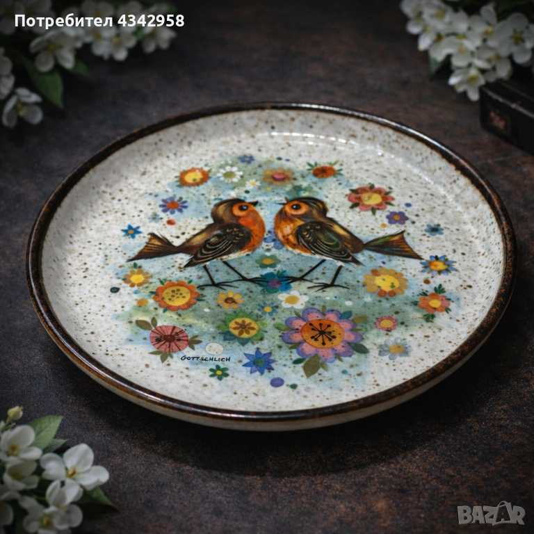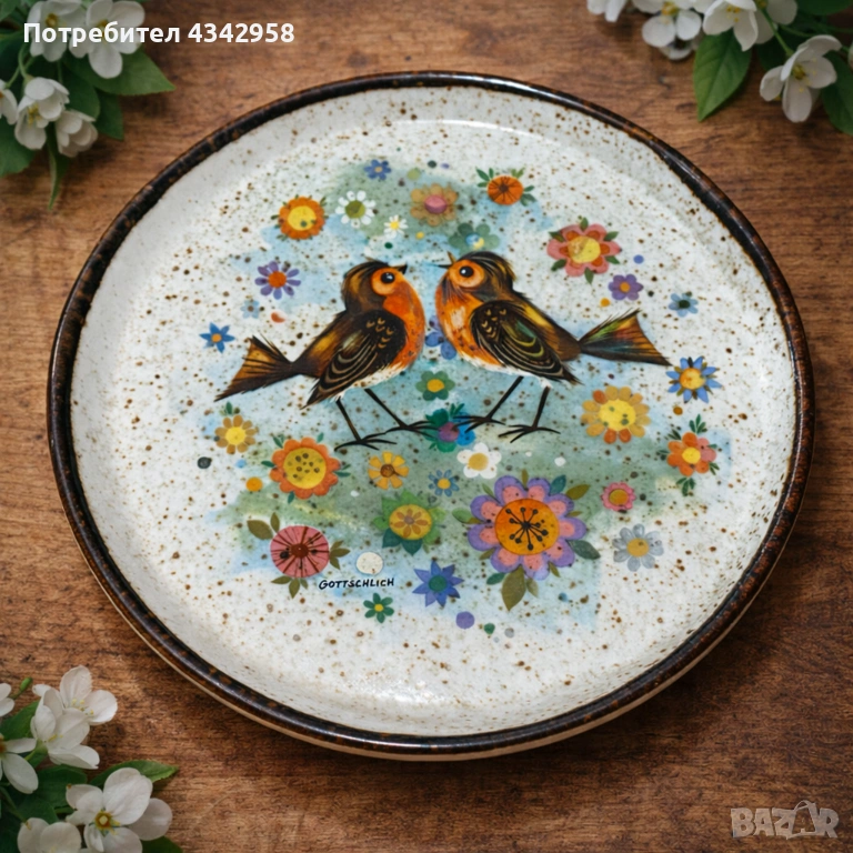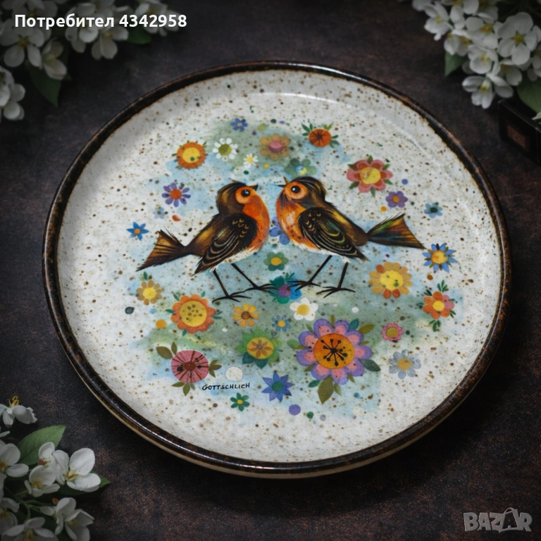 Красива винтидж декоративна чиния с илюстрация на две птици и цветя, подписана Gottschlich (немски художник, популярен през 60–70-те години).