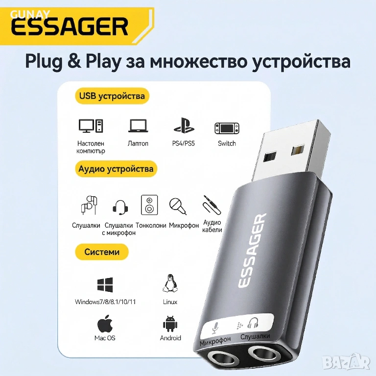 външна звукова карта, usb аудио адаптер, usb към 3.5mm, essager аудио адаптер, dac адаптер за слушалки, преходник usb към жак, звукова карта за лаптоп, звукова карта за pc, звукова карта за ps5, звукова карта за ps4, usb sound card, usb audio adapter, usb dac, външен дак, hi-fi dac, аудио интерфейс, резервна звукова карта, преходник за микрофон, аудио кабел, слушалки с микрофон, геймърски слушалки, аксесоари за лаптоп, компютърна периферия, ugreen звукова карта, baseus аудио адаптер, anker аудио, apple usb c to 3.5mm, samsung аудио адаптер, vention usb sound card, rocoren аудио