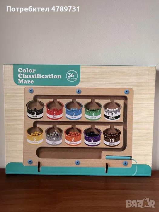 Дървен магнитен лабиринт за изучаване на цветове, числа и броене по забавен и интерактивен начин. Разполага с 10 цветни „кутии с боя“ (1–10) и 55 магнитни мъниста в ярки цветове.