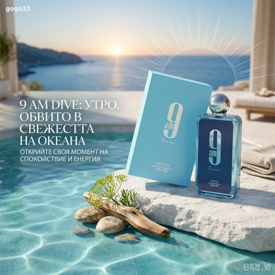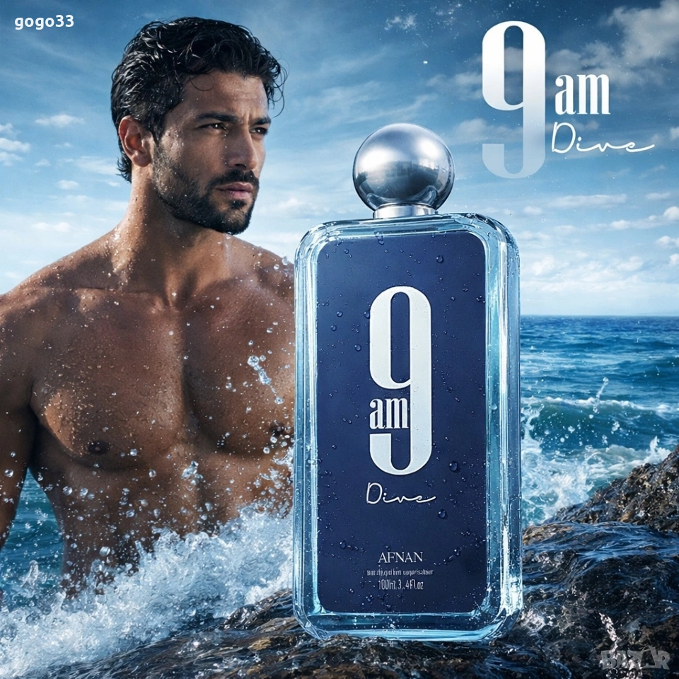 Унисекс парфюм Afnan 9 AM Dive с освежаващи и дървесни нотки, 100мл Цена: 26 евро Тип: Парфюмна вода (Eau de Parfum) Обем: 100 мл Пол: Унисекс Връхни нотки: лимон, мента, касис, розов пипер Средни нотки: ябълка, тамян, кедър Базови нотки: джинджифил, пачули, сандалово дърво, жасмин Акорди: плодови, дървесни, зелени, топло-пикантни Подходящ за: ежедневна употреба и специални поводи