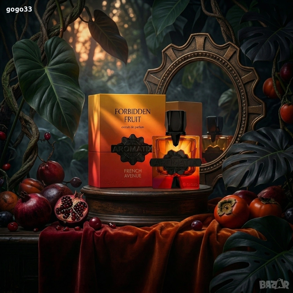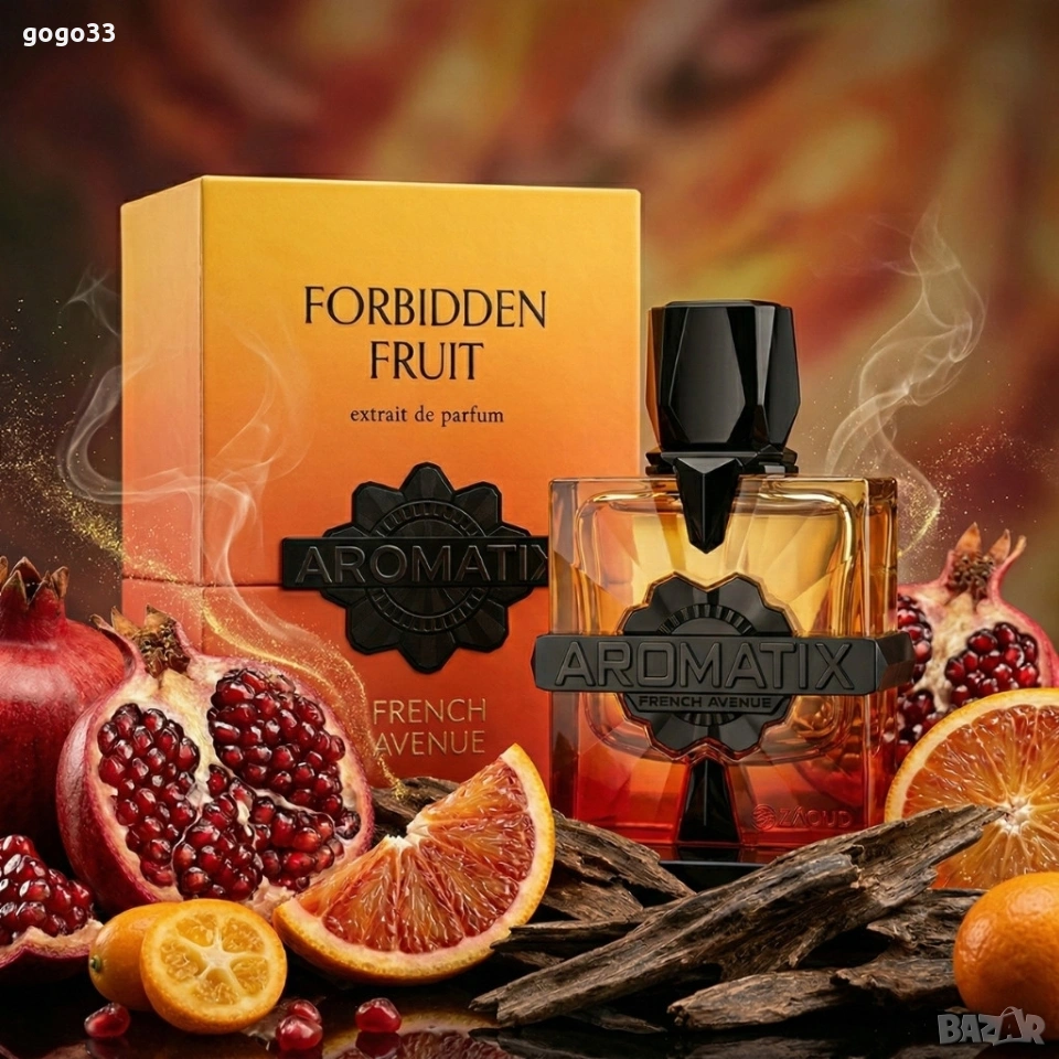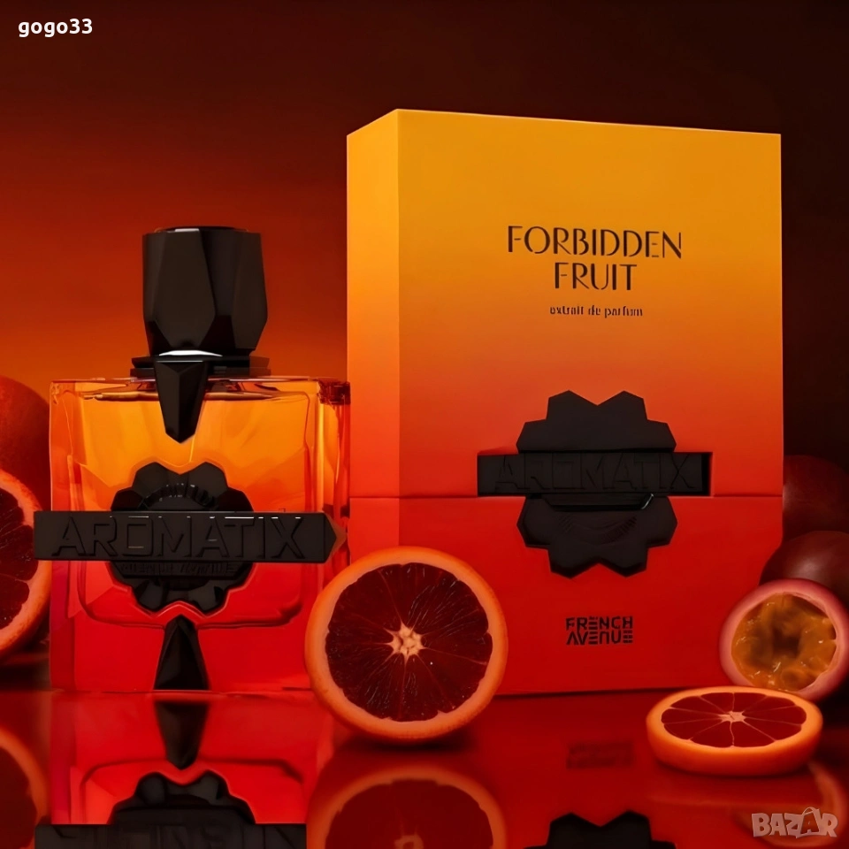 Дълготраен унисекс аромат French Avenue Aromatix Forbidden Fruit, EDP, 100мл Цена: 35 евро Концентрация: парфюм (extrait de parfum) — висока интензивност и дълготрайност. Тип аромат: плодови с дървесни и ориенталски акценти. Връхни ноти: бергамот, кървав портокал, кардамон. Сърдечни ноти: праскова, червена ябълка, роза. Базови ноти: кехлибар, бензоин, кедрово дърво, мускус, сандалово дърво, ванилия. Обем: 100 мл. Подходящ за: специални поводи и ежедневна употреба за всеки, който търси силен, плодов и съблазнителен аромат.