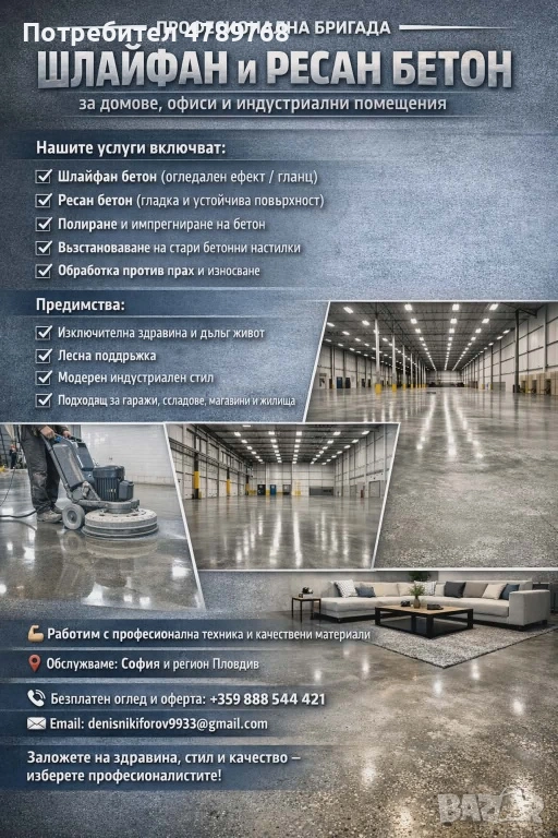 Професионална бригада предлага изработка на шлайфан и ресан бетон за домове, офиси и индустриални помещения.