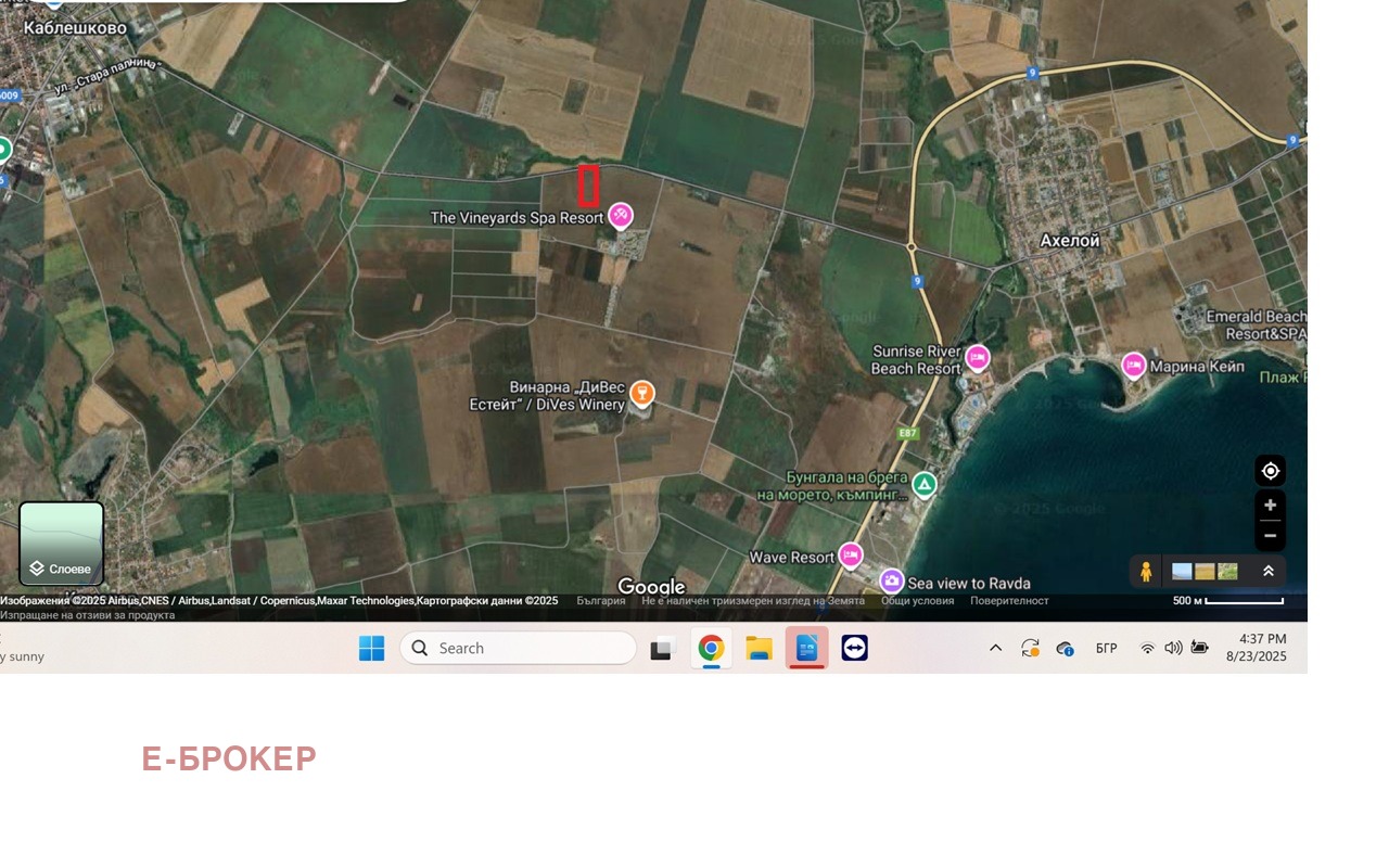 Има одобрен ПУП за вилно селище. Кинт 0, 8; Плътност на застрояване 30% К. к. 7м. Имотът е с 50м лице на пътя Каблешково Ахелой, под Апарт хотел Винярдс. На метри от водопровода към комплекса.