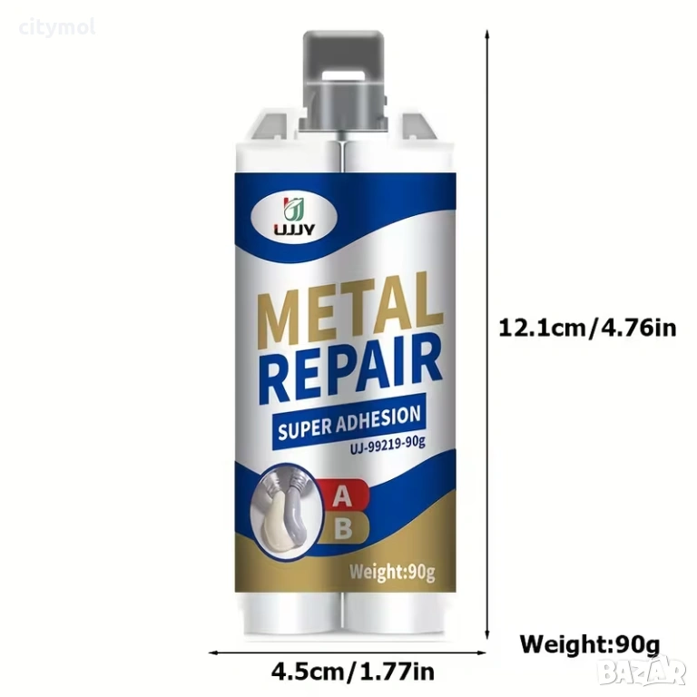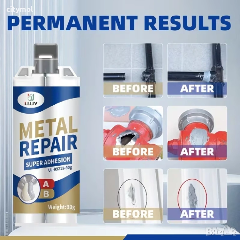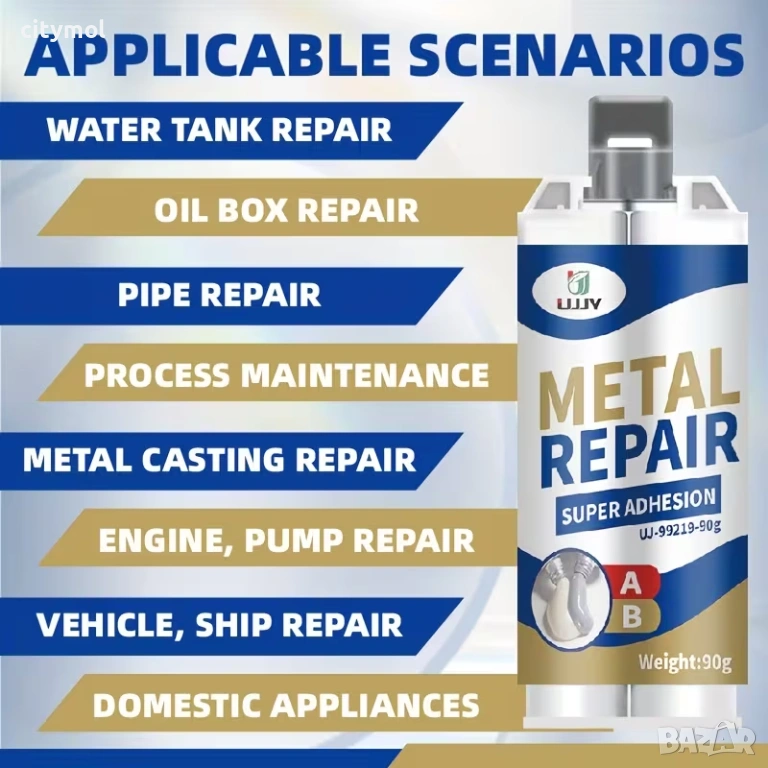 Двукомпонентно лепило за ремонт на метал и пластмаса. Бързо и надеждно лепи части от всякакви метали и сплави (стомана, чугун, алуминий, мед, месинг, бронз, магнезий, калай, олово и др.) във всякаква комбинация. Идеален за бързи ремонти с дългосрочен ефект, например: за запечатване на пукнатини и кухини на повърхности с всякаква форма, възстановяване на повредени резби, както вътрешни, така и външни. Може да се използва както при ремонт на автомобили и друга техника, така и в промишлеността, у дома и в офиса. Втвърдява се в рамките на минути. Окончателното втвърдяване се извършва в рамките на 24 часа, съединението придобива висока механична якост на срязване (3-5 N / mm²) и може да издържи на температури от - 60 до +200 ° C.