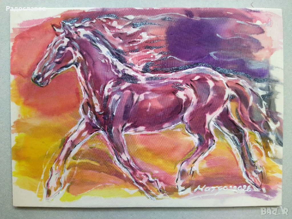 Материал коприна, бои и контури за коприна, акварена техника, 13/ 18см. При откупка ще бъде направен сертификат за автентичност.