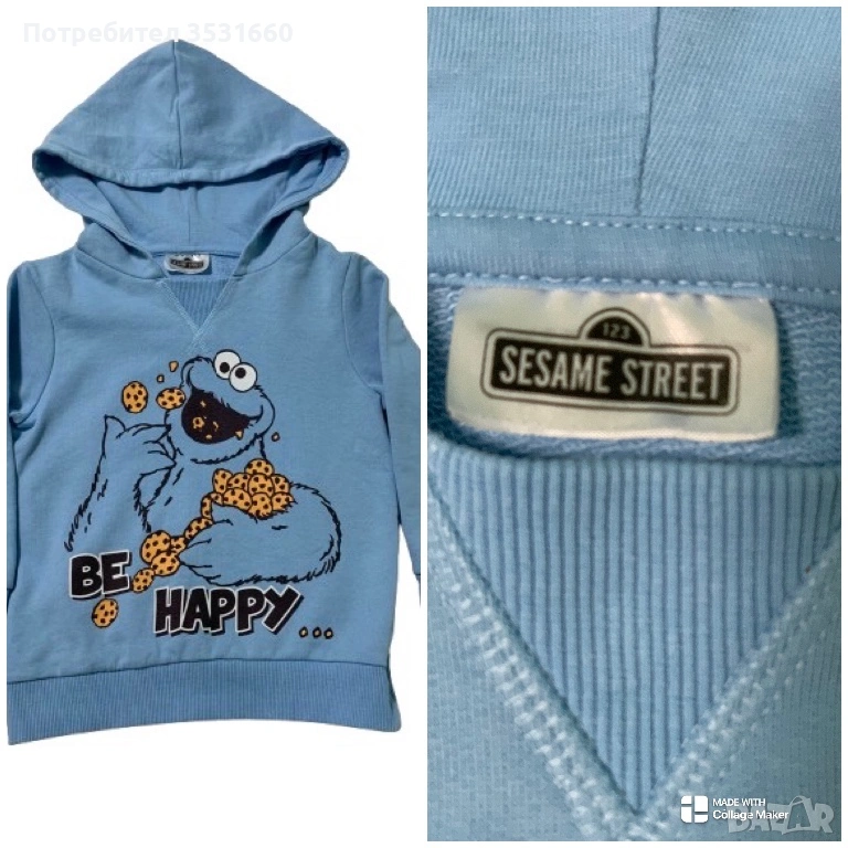 -светлосин детски суичър с качулка на Cookie Monster от „Улица Сезам“, -цена 5€,
