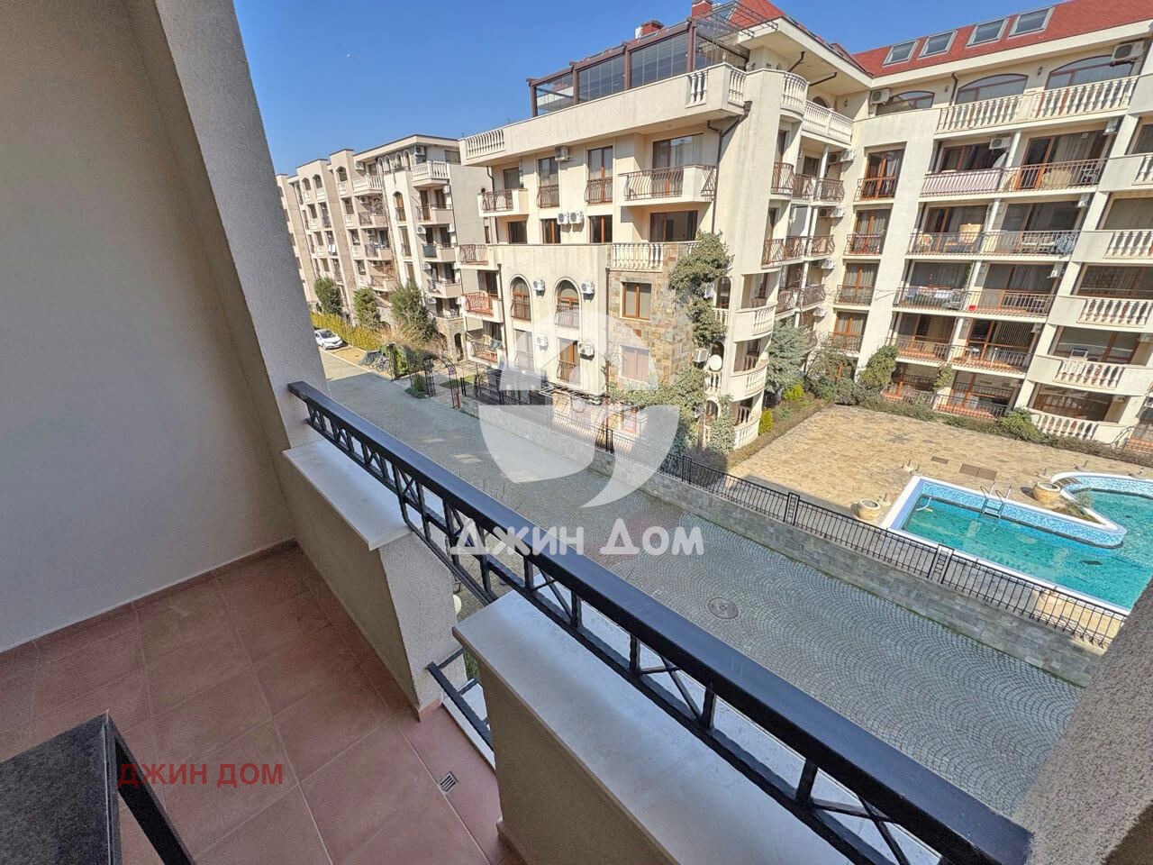 Апартаментът се състои от: хол с кухненски бокс, баня с тоалетна и душ кабина, тераса с гледка към басейна.