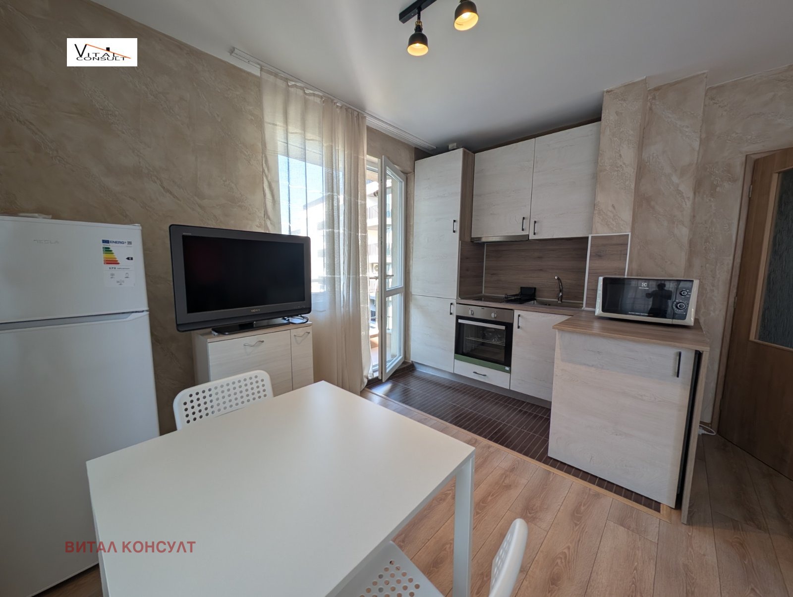 РЕАЛНА ОФЕРТА; Нова сграда с оградена паркова зона; След основен ремонт и ново обзавеждане; Кухненски бокс с вградена кухня, дневна част с холна гарнитура и секция, трапезна маса, тераса към вътрешен двор, стая със спалня комплект и тераса, втора стая легло и гардероб, баня с тоалетна-заедно, антре с гардероб и шкаф за обувки; Сградата е с отлична локация - в непосредствена близост до спирки на градски транспорт, магазини на големите вериги, бърз и лесен достъп до бул. Симеоновско шосе и Околовръстното; възможност за подземен гараж 150 евро;