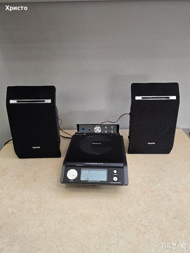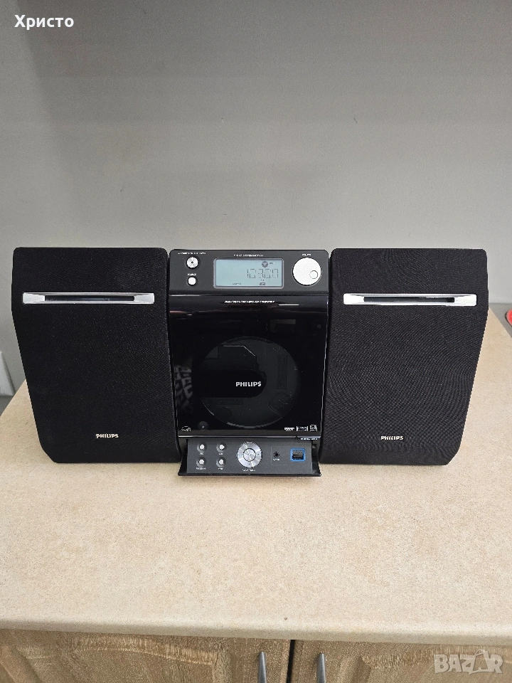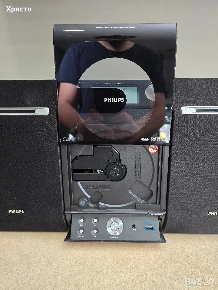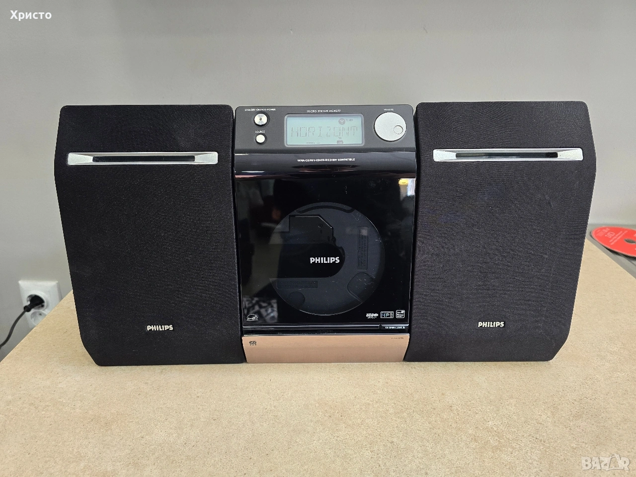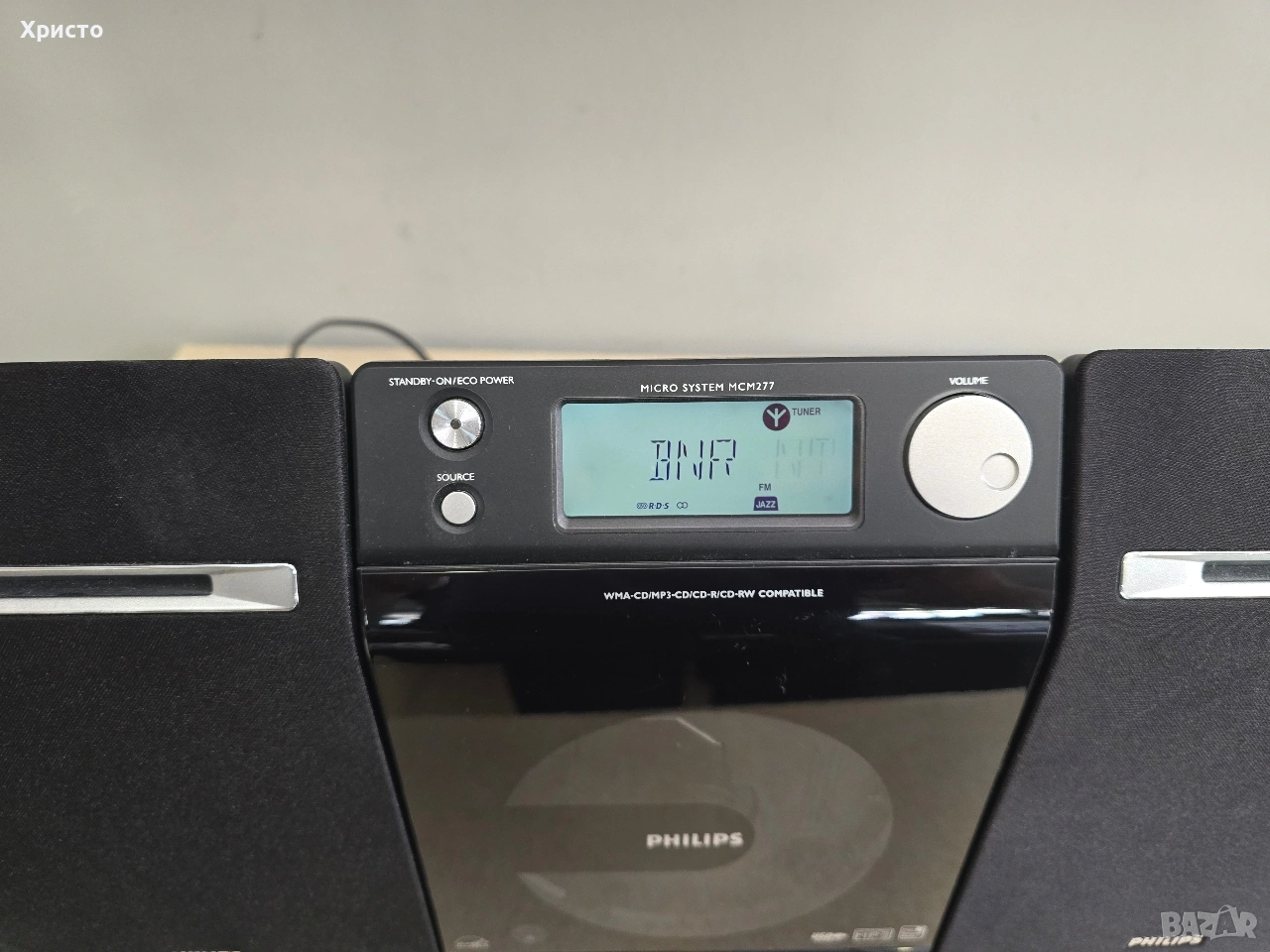 MCM277/12 Philips. Тази микро музикална система Philips съчетава стилен дизайн и възпроизвеждане на MP3/WMA-CD и USB Direct, като може да се монтира и на стена.. Колоните се разделят. Звук: Изходна мощност 2 x 5 W RMS, 2 x 10W музикална мощност. Подобрение на звука: управление на цифров звук в 4 режима, динамично усилване на басите. Високоговорители: Мембрани на високоговорителите 4" високоговорител за ниски честоти. Тип високоговорители: система басрефлексни високоговорители.