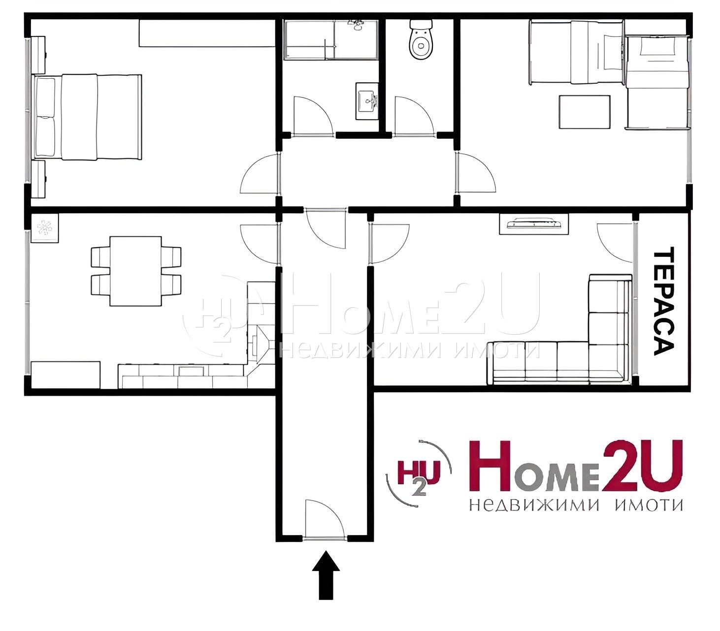 входно антре, кухня, всекидневна с излаз на тераса, второ антре, две непреходни спални, баня и отделна тоалетна.