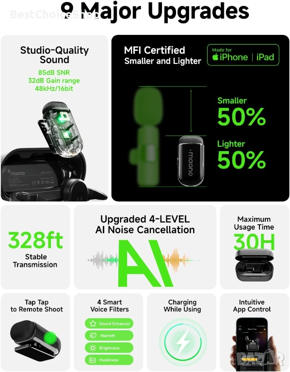 MAONO Wave T1 Mini безжичен лавалиер микрофон с USB-C жак, шумопотискане, AI гласов филтър, 30H, използва се с аксесоари за видеозапис TikTok YouTube